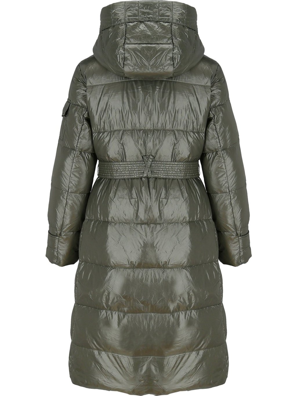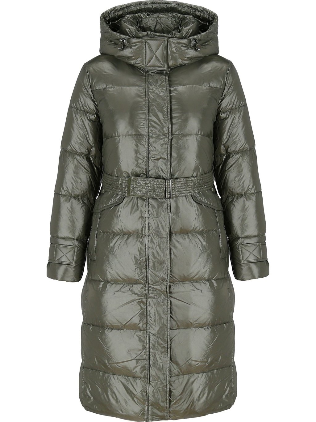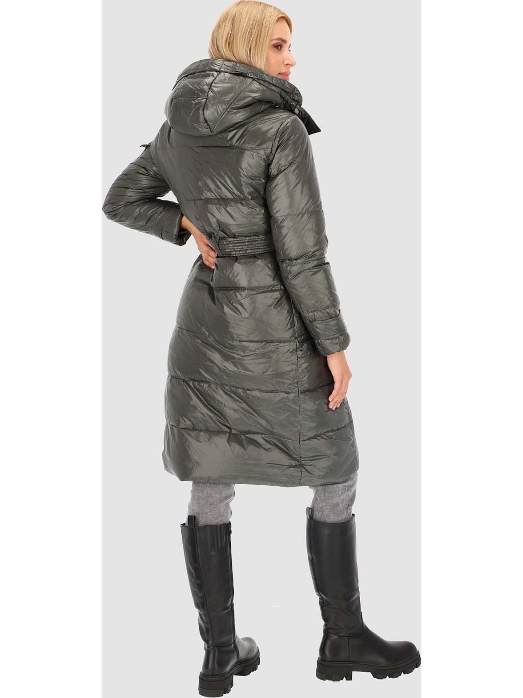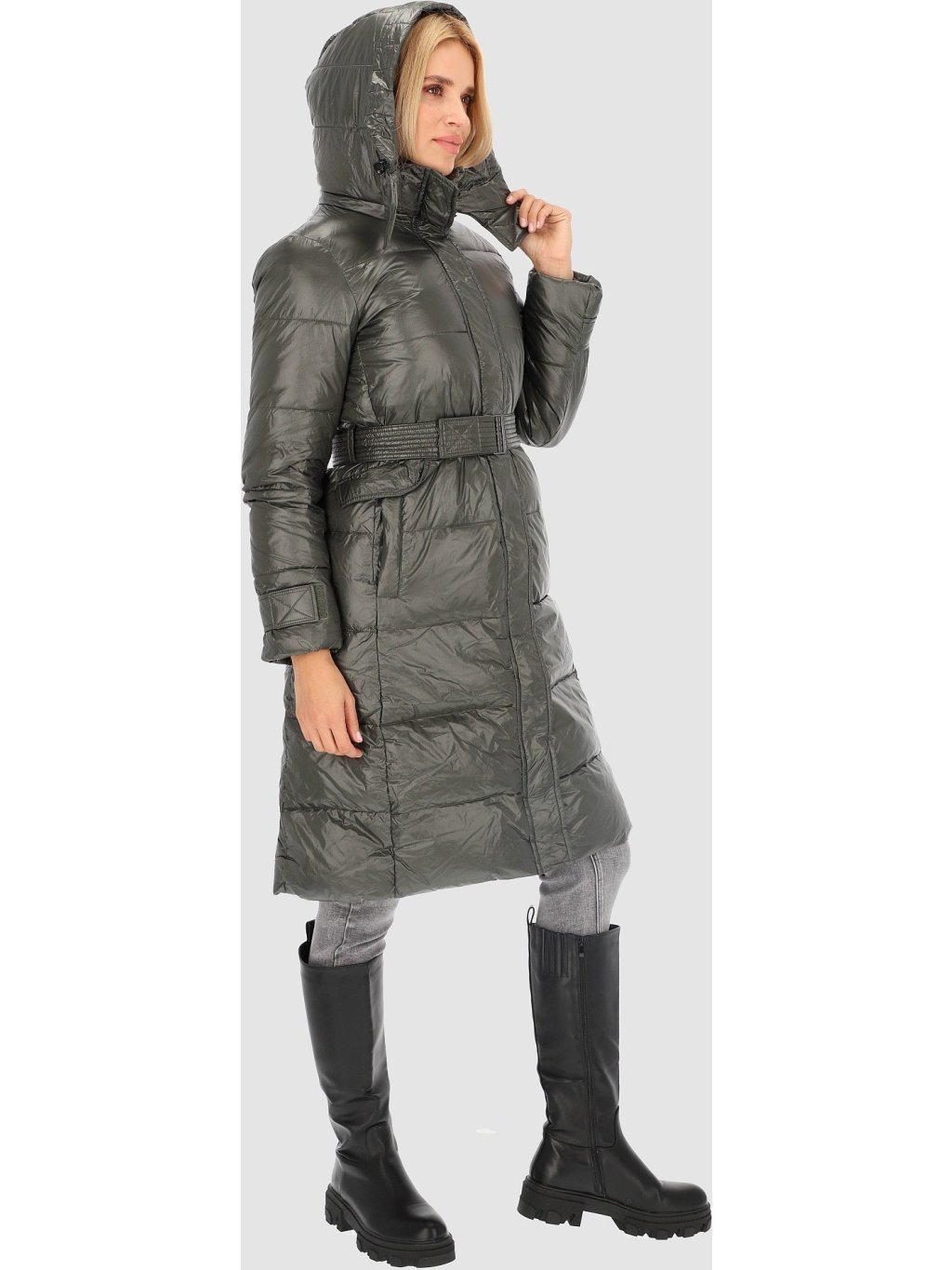 Khaki dámský dlouhý péřový kabát s páskem