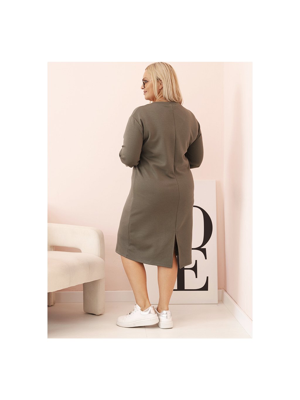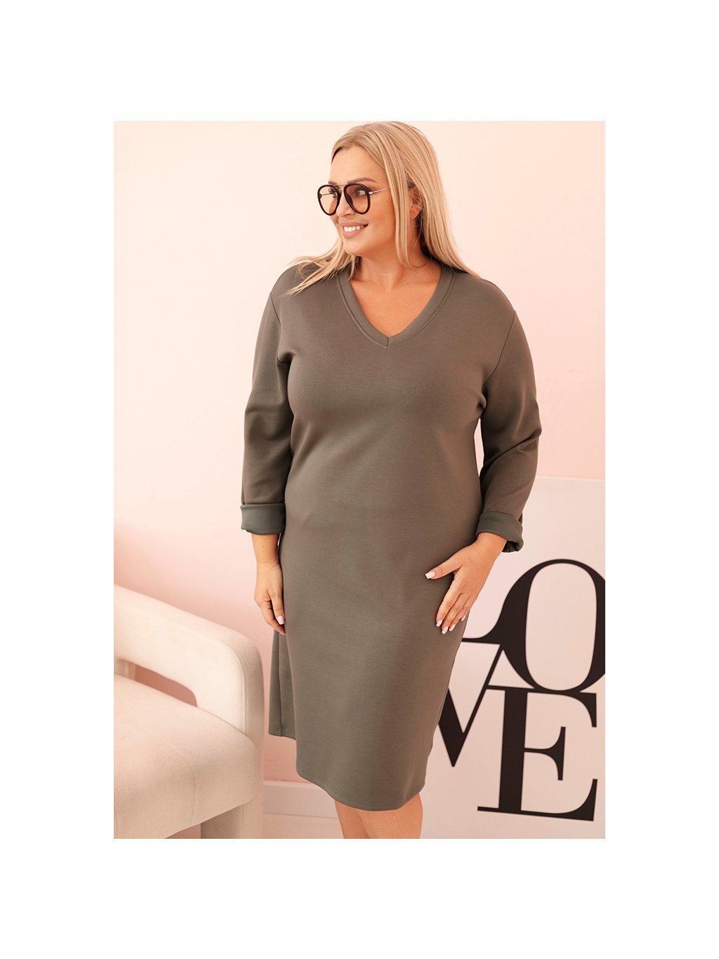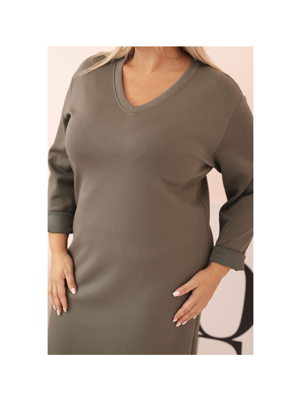 Khaki Plus Size šaty s výstřihem do V a 3/4 rukávy