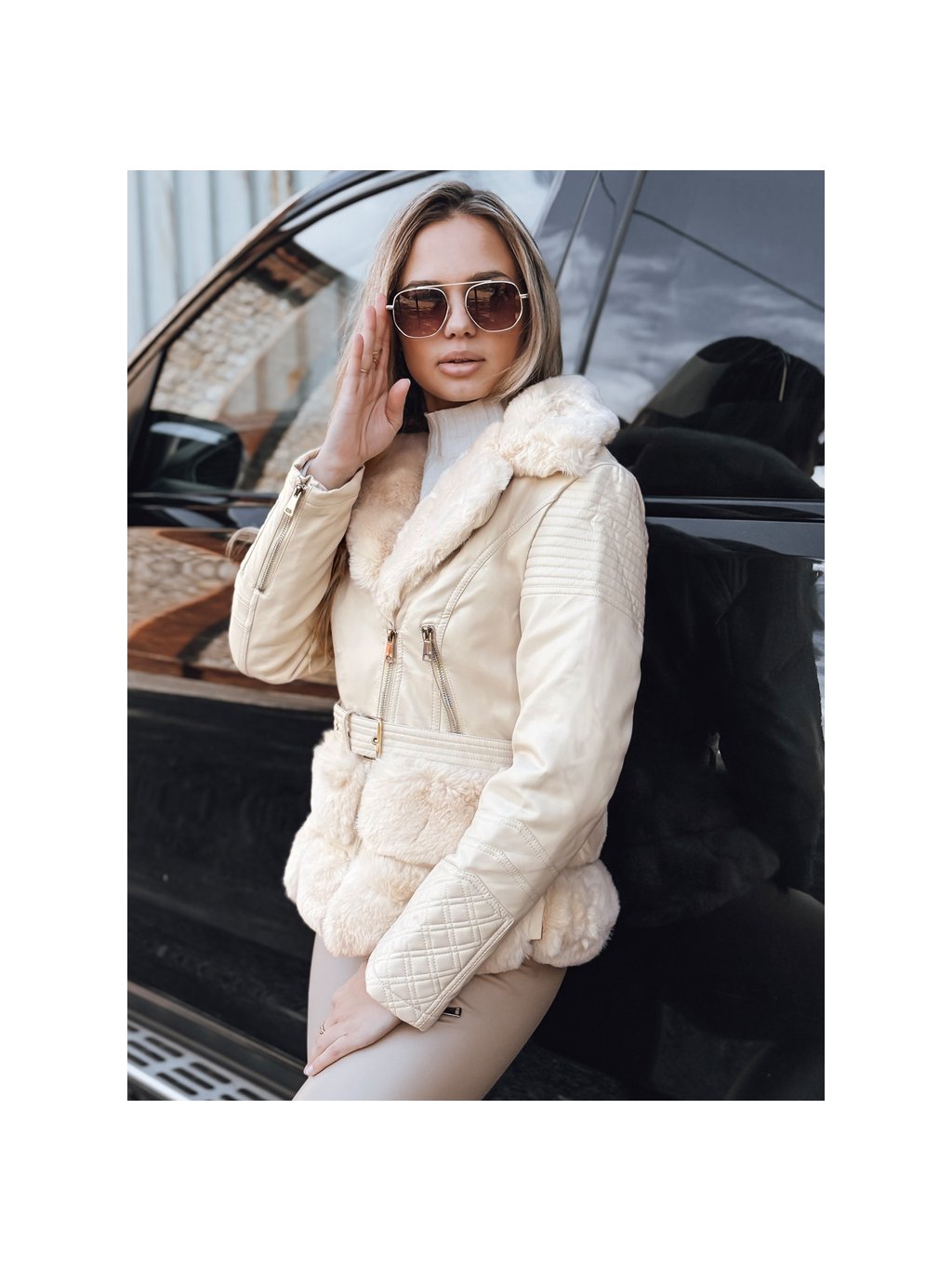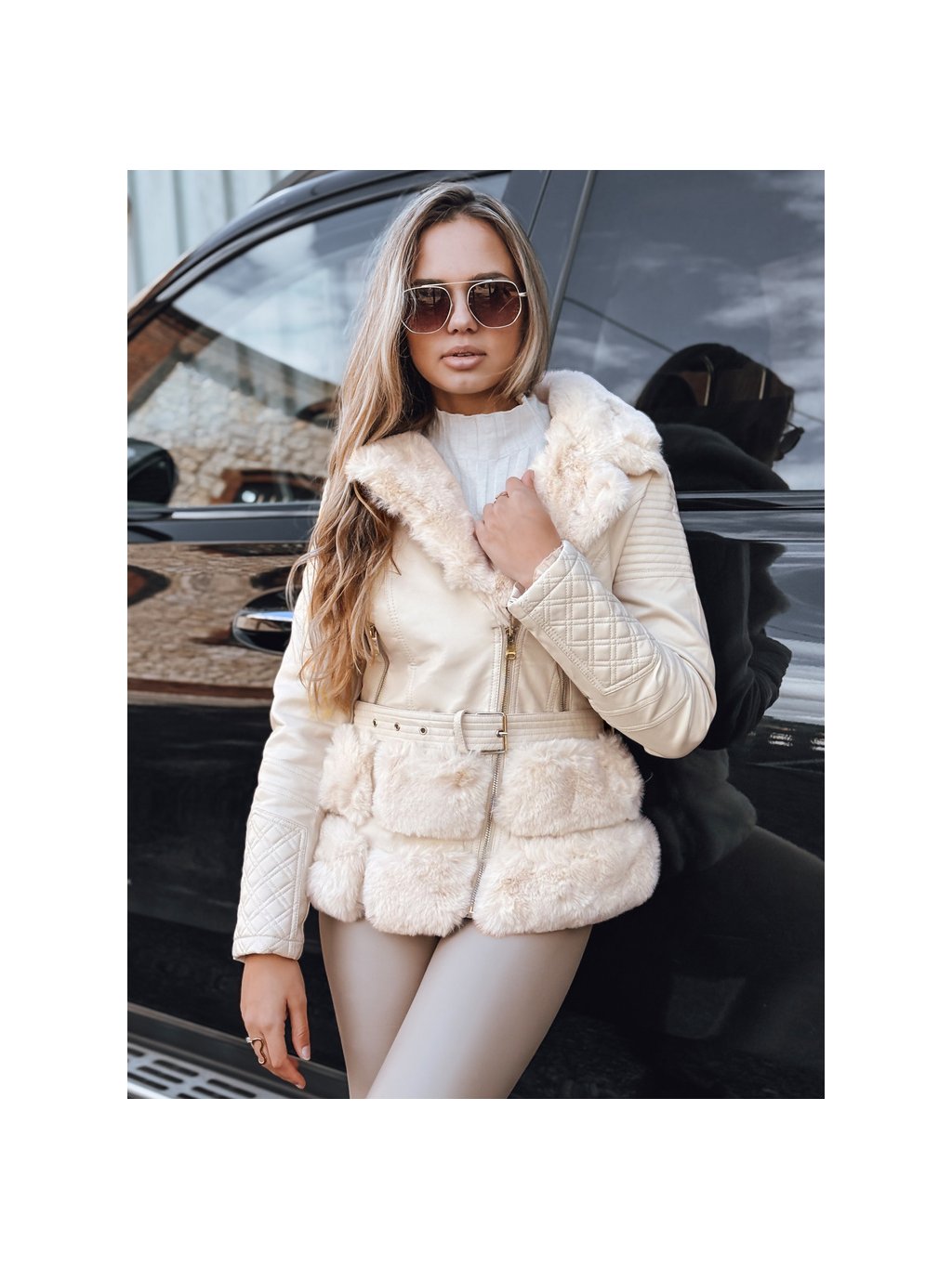 Krémová dámská koženková bunda s kožíškem