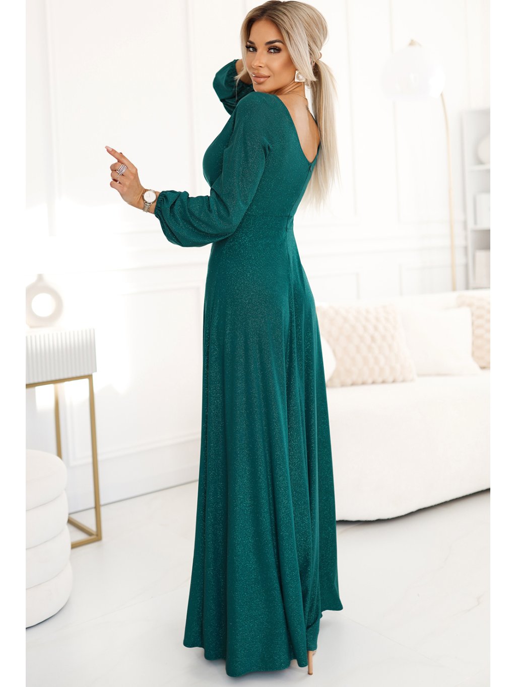 Lahvově zelené lesklé dlouhé šaty s výstřihem a dlouhými rukávy
