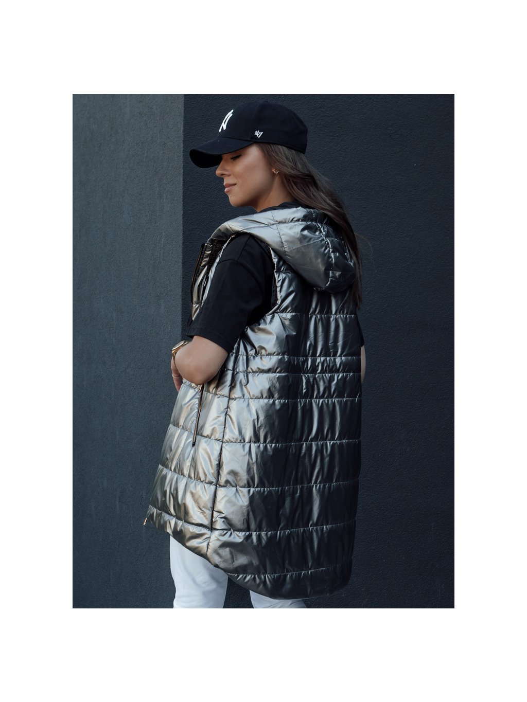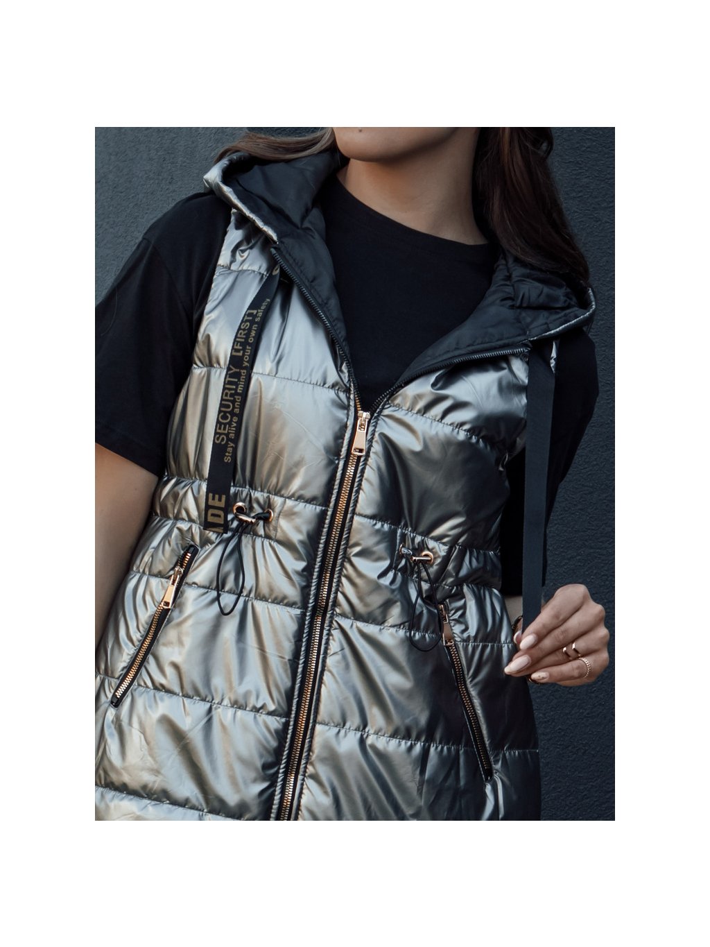 Lesklá tmavě šedá dámská prošívaná vesta PIXIECODE