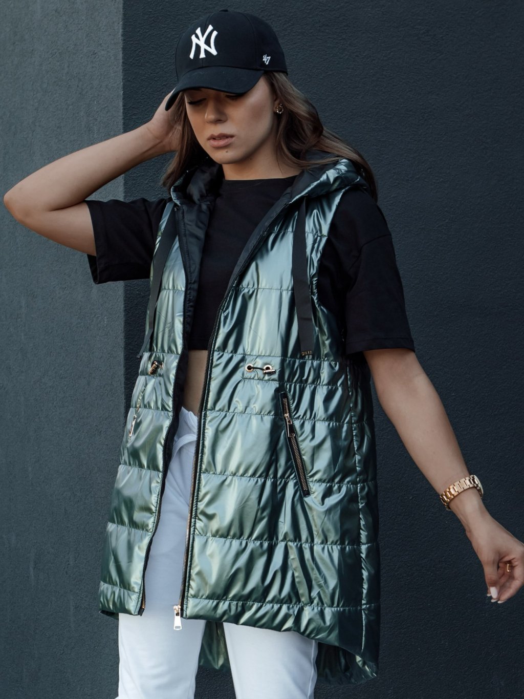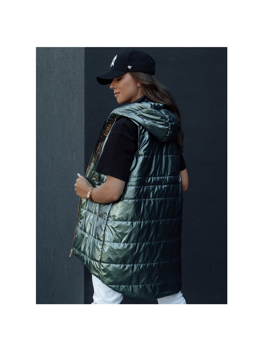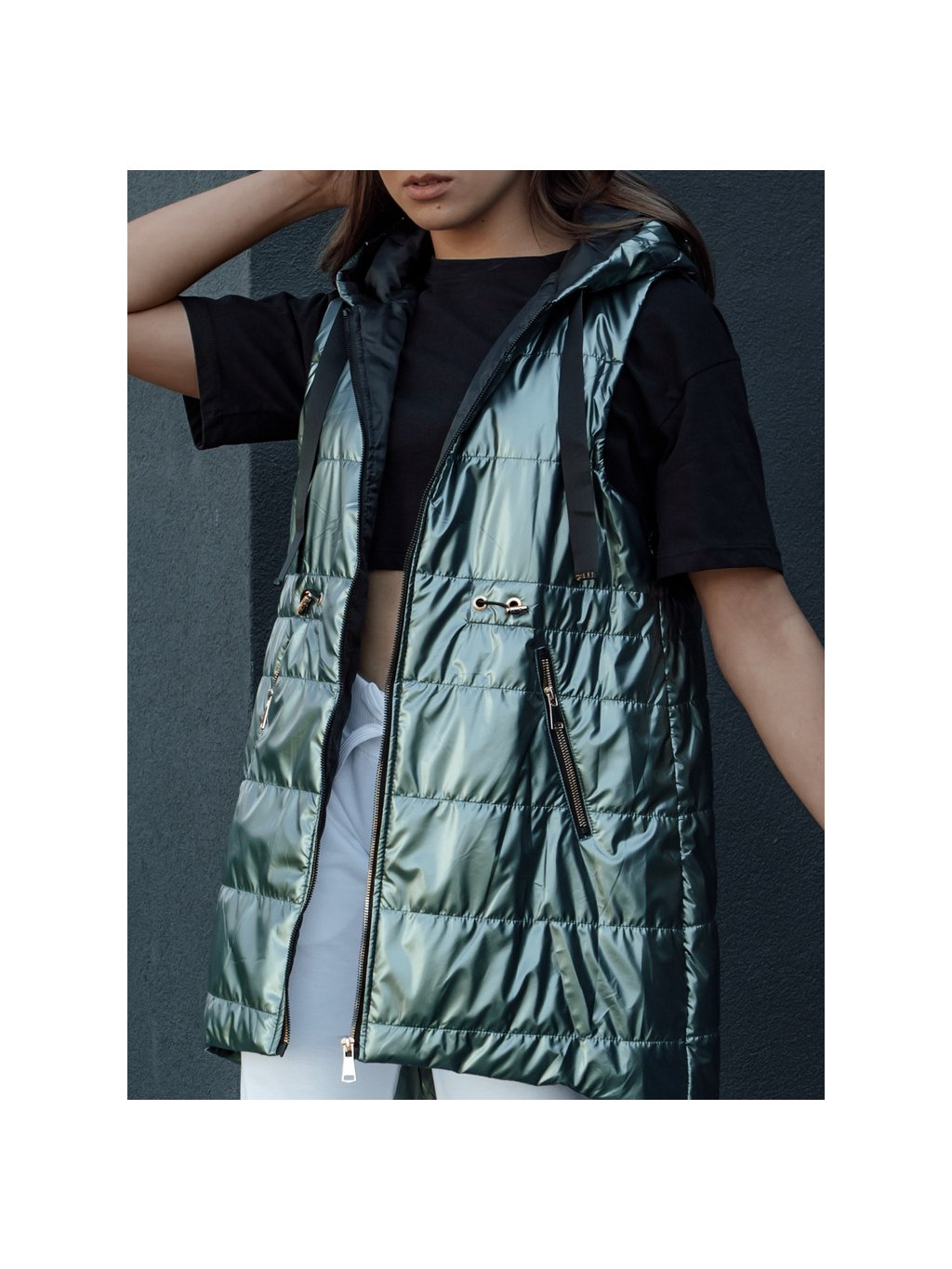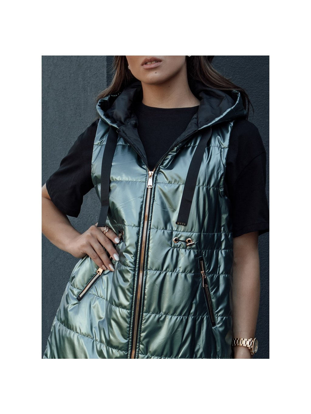 Lesklá tmavě zelená dámská prošívaná vesta PIXIECODE