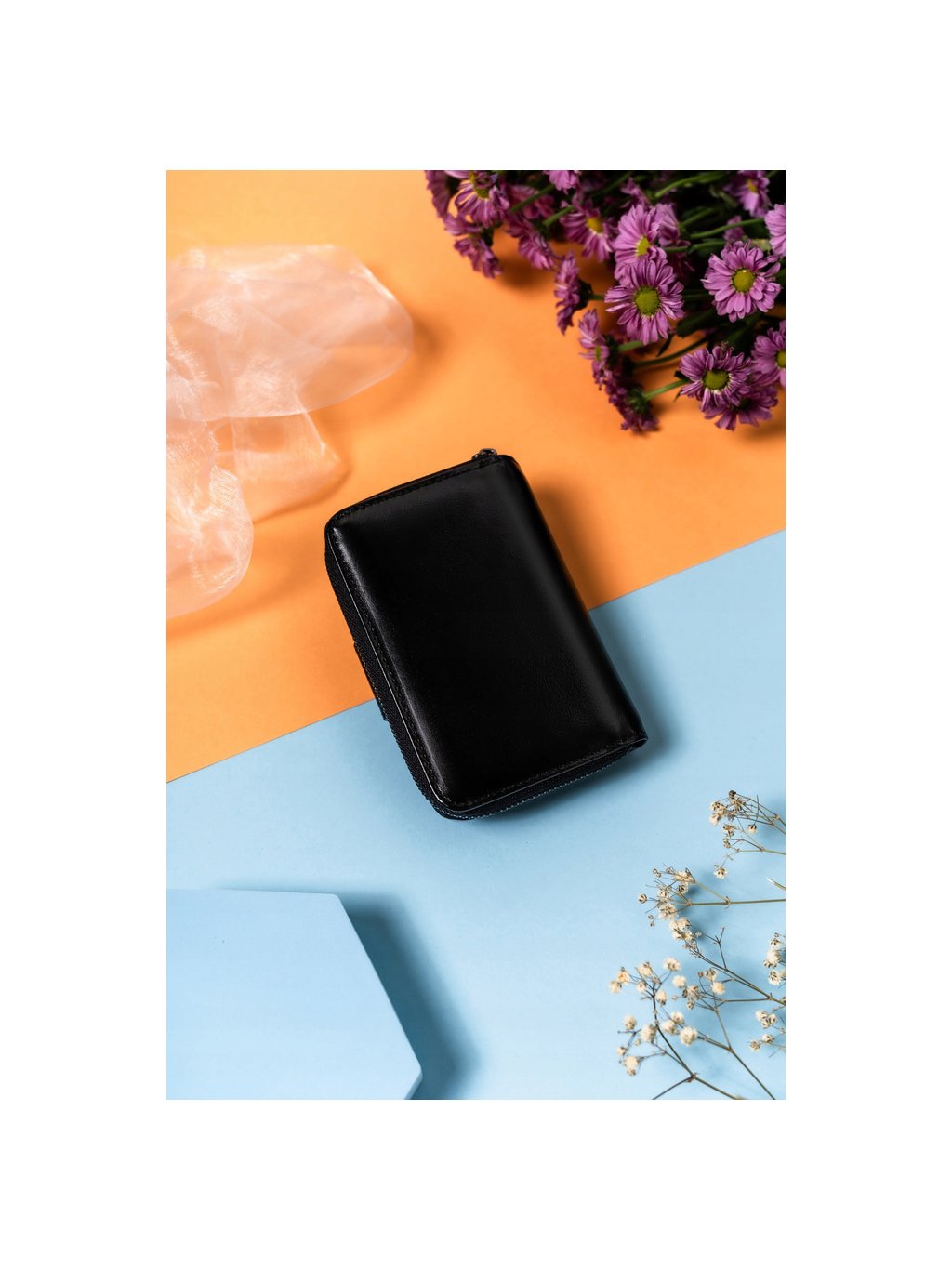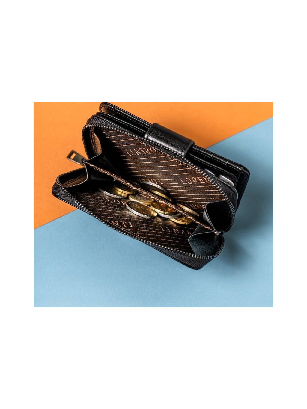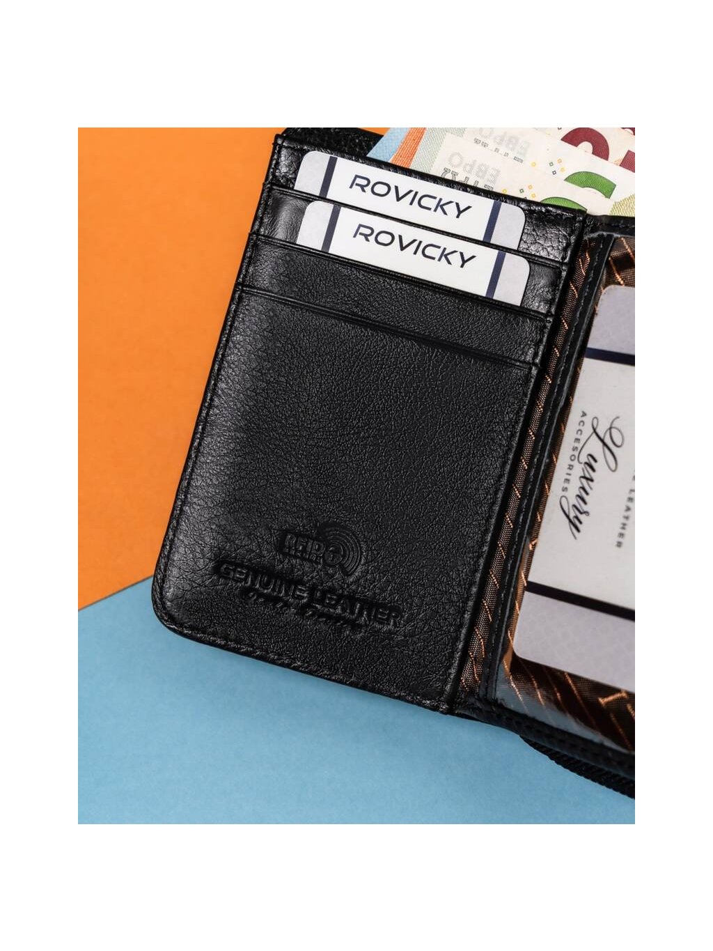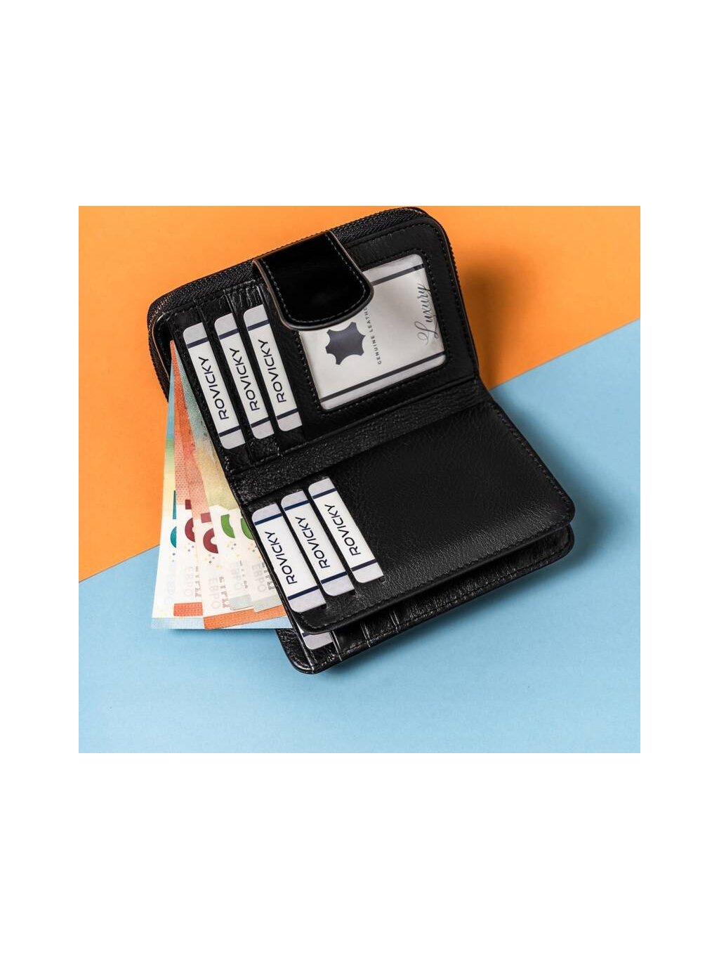 - uvnitř je 9 míst pro karty, 4 přihrádky pro větší doklady, 1 kapsa na mince, rozdělená na dvě části, přihrádka na bankovky