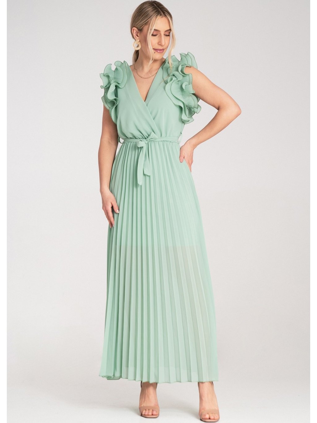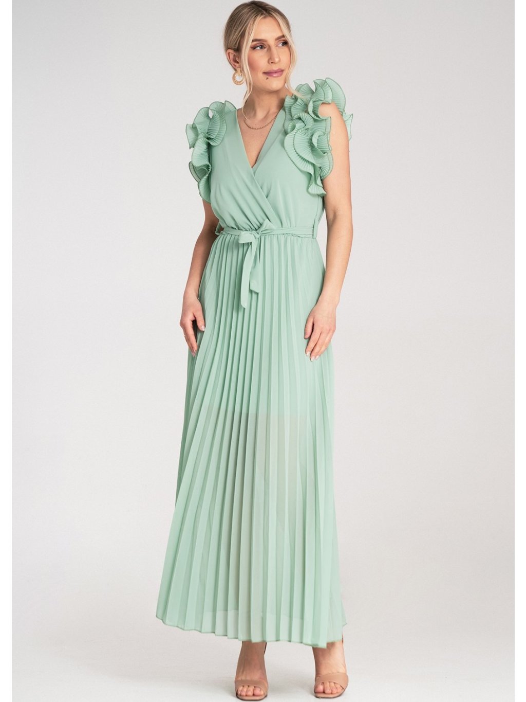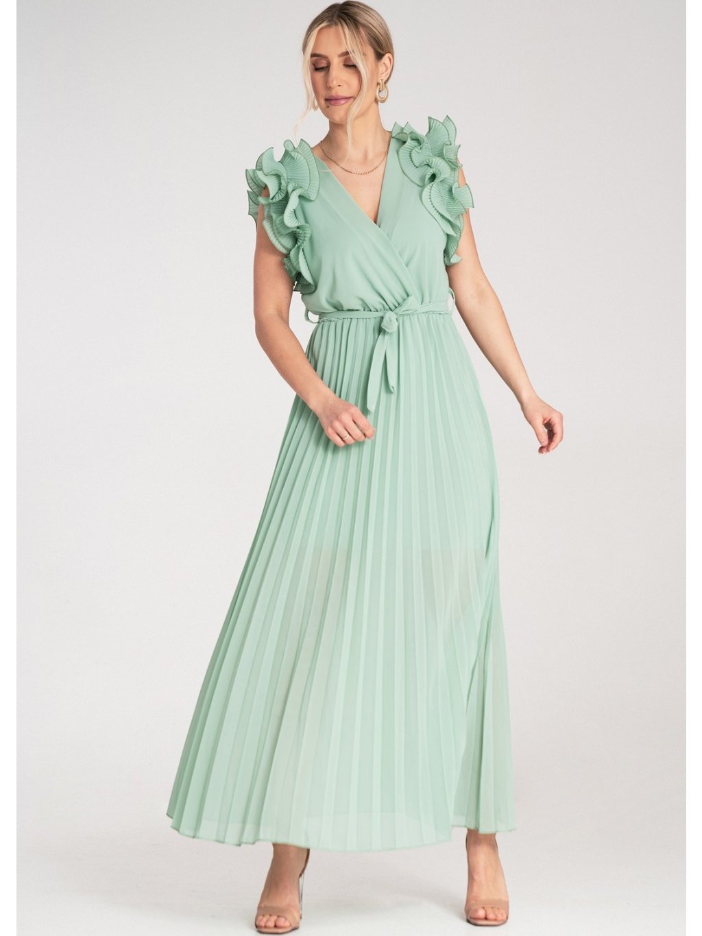 Mátové maxi šaty s výstřihem do V a ozdobnými volánky na ramenou