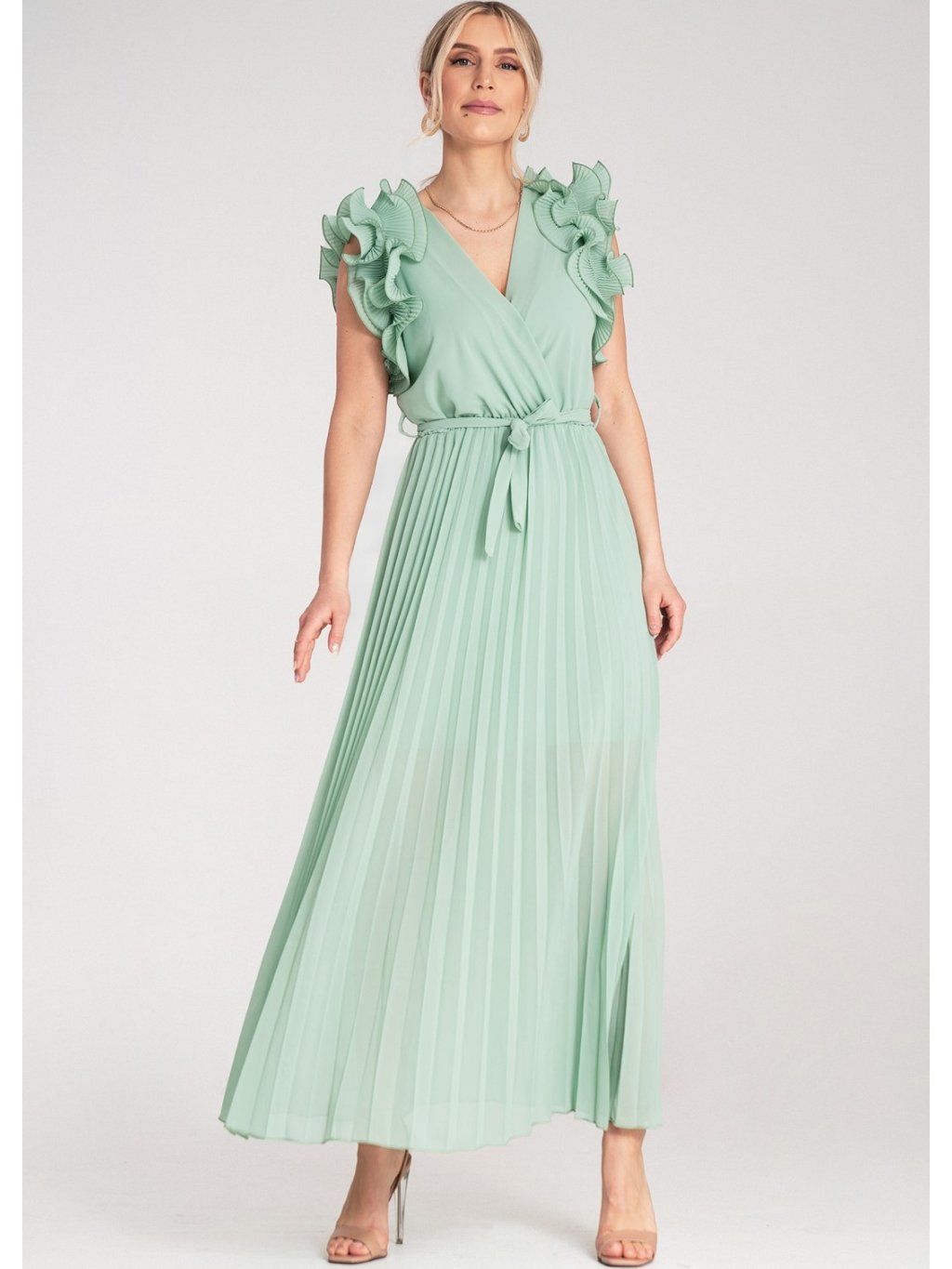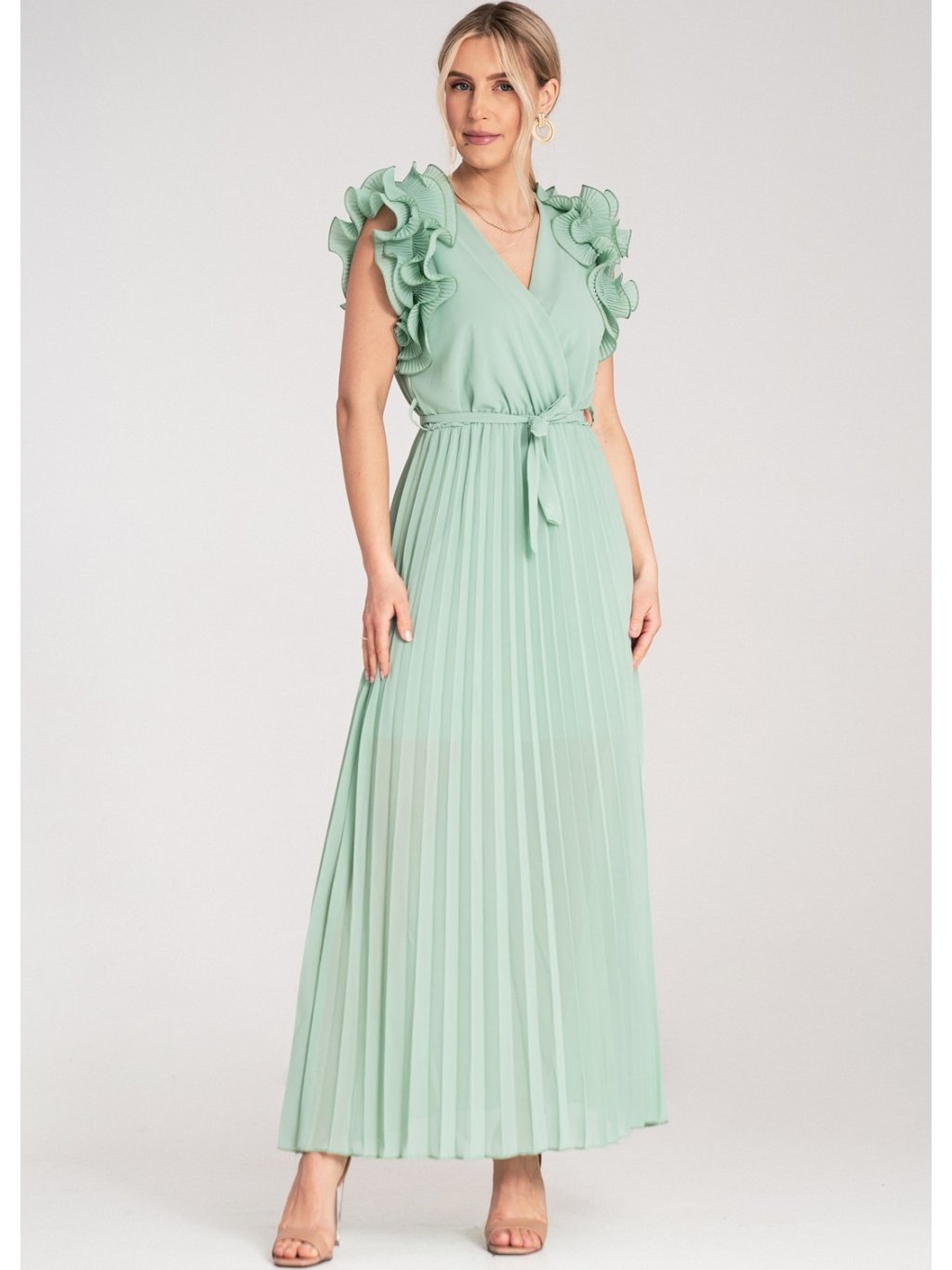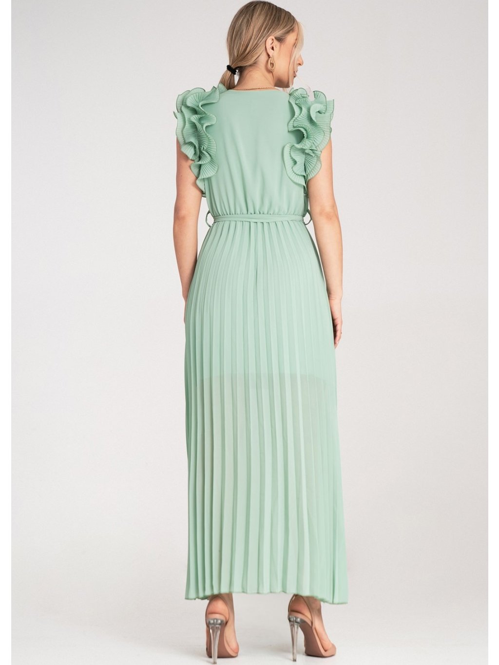 Mátové maxi šaty s výstřihem do V a ozdobnými volánky na ramenou