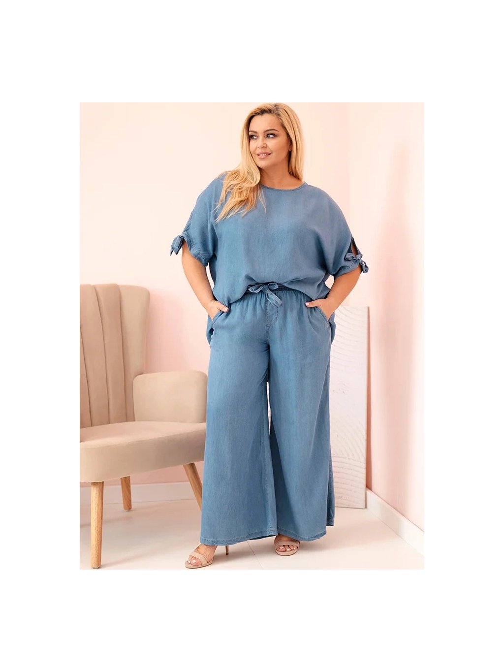 Modrá dámská plus size souprava halenky a širokých kalhot