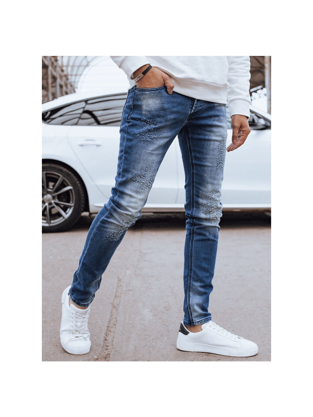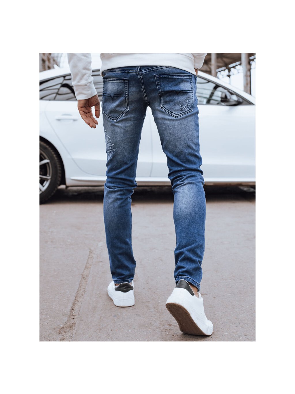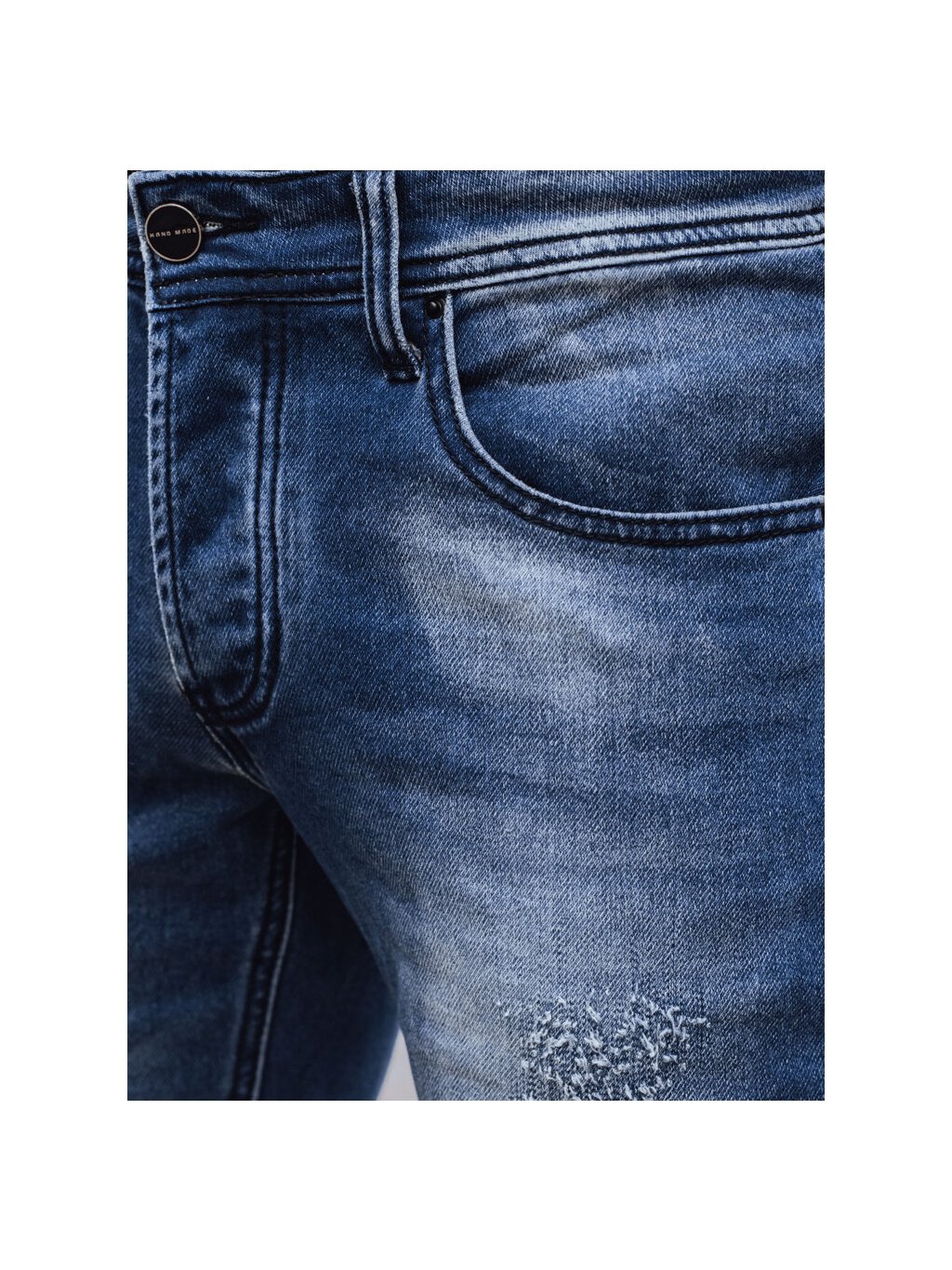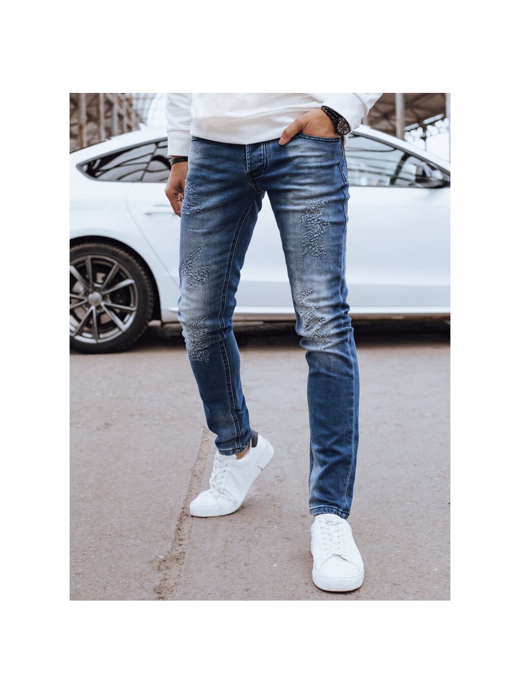 Modré džíny s módními oděrkami