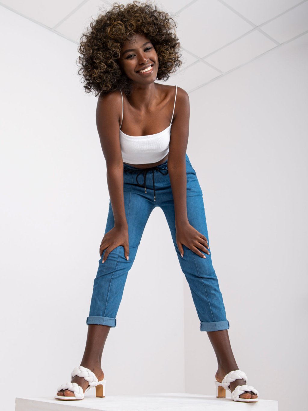 Modelka na obrázcích je vysoká 168 cm, obvod přes prsa má 82 cm, obvod pasu 62 cm a přes boky 93 cm.