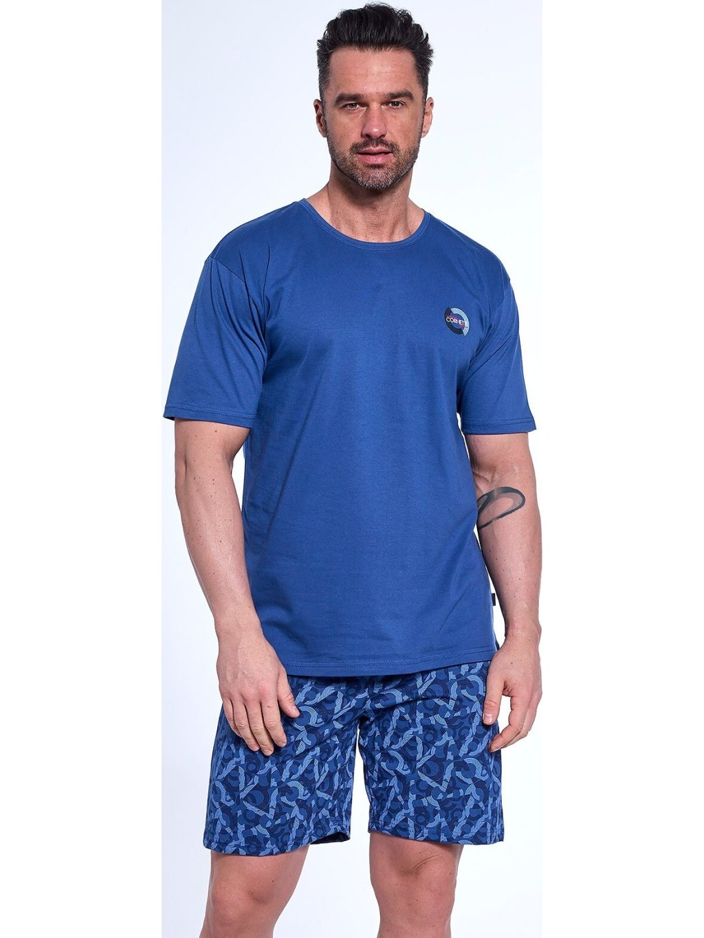 Modré pánské bavlněné pyžamo se vzorovanými kraťasy Cornette