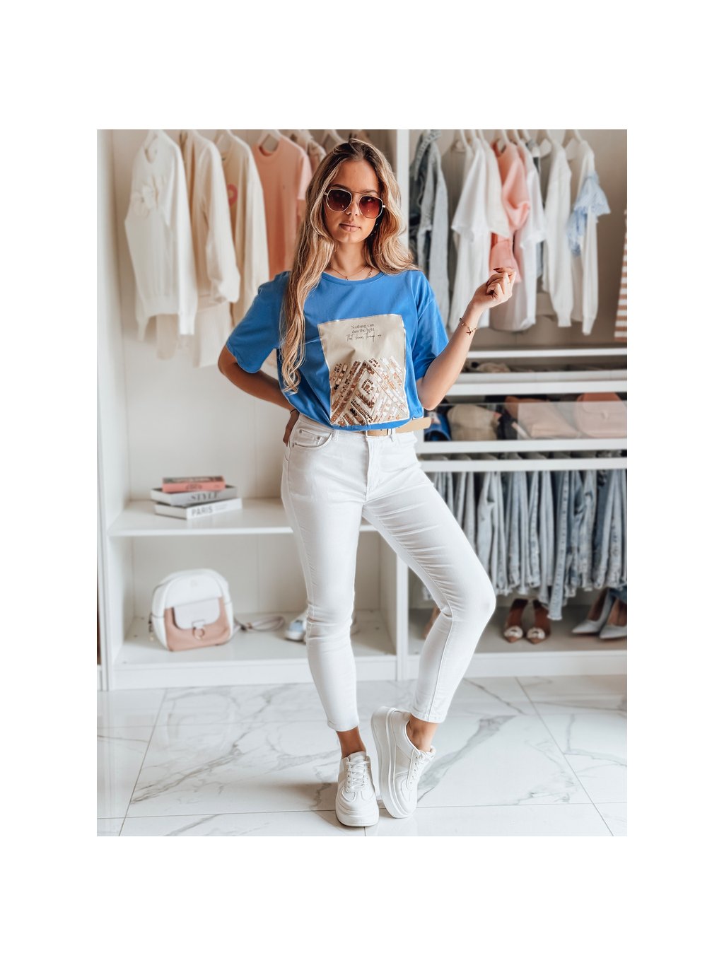 Modré tričko s potiskem flitrů CENTIA