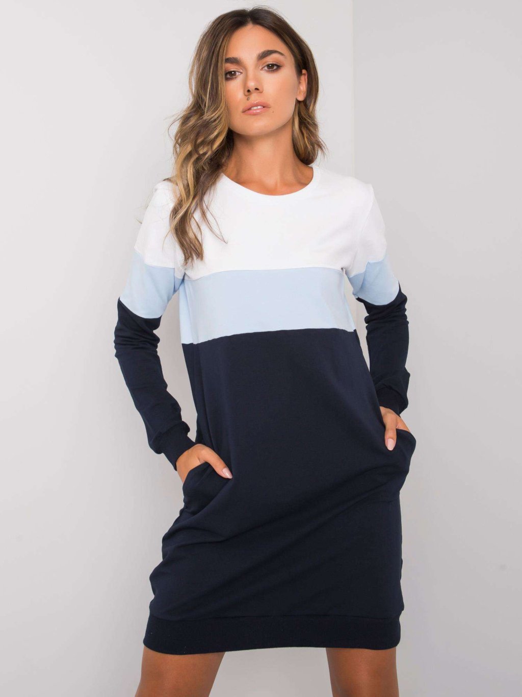 Modro-bílé mikinové šaty s kapsami
