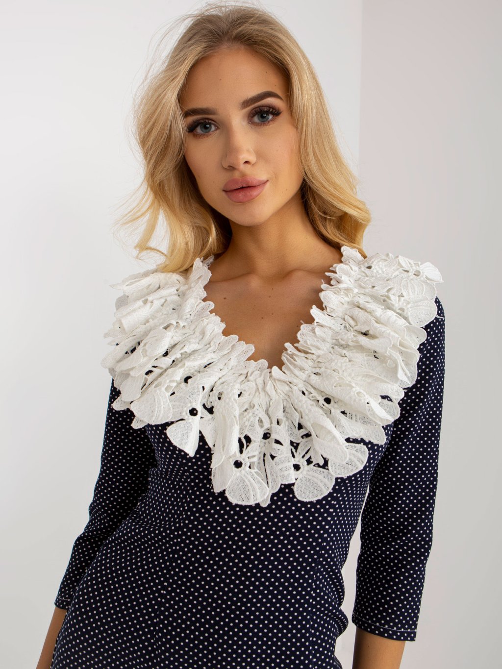 Modelka na obrázcích je vysoká 175 cm, obvod přes prsa má 84 cm, obvod pasu 62 cm a přes boky 93 cm.