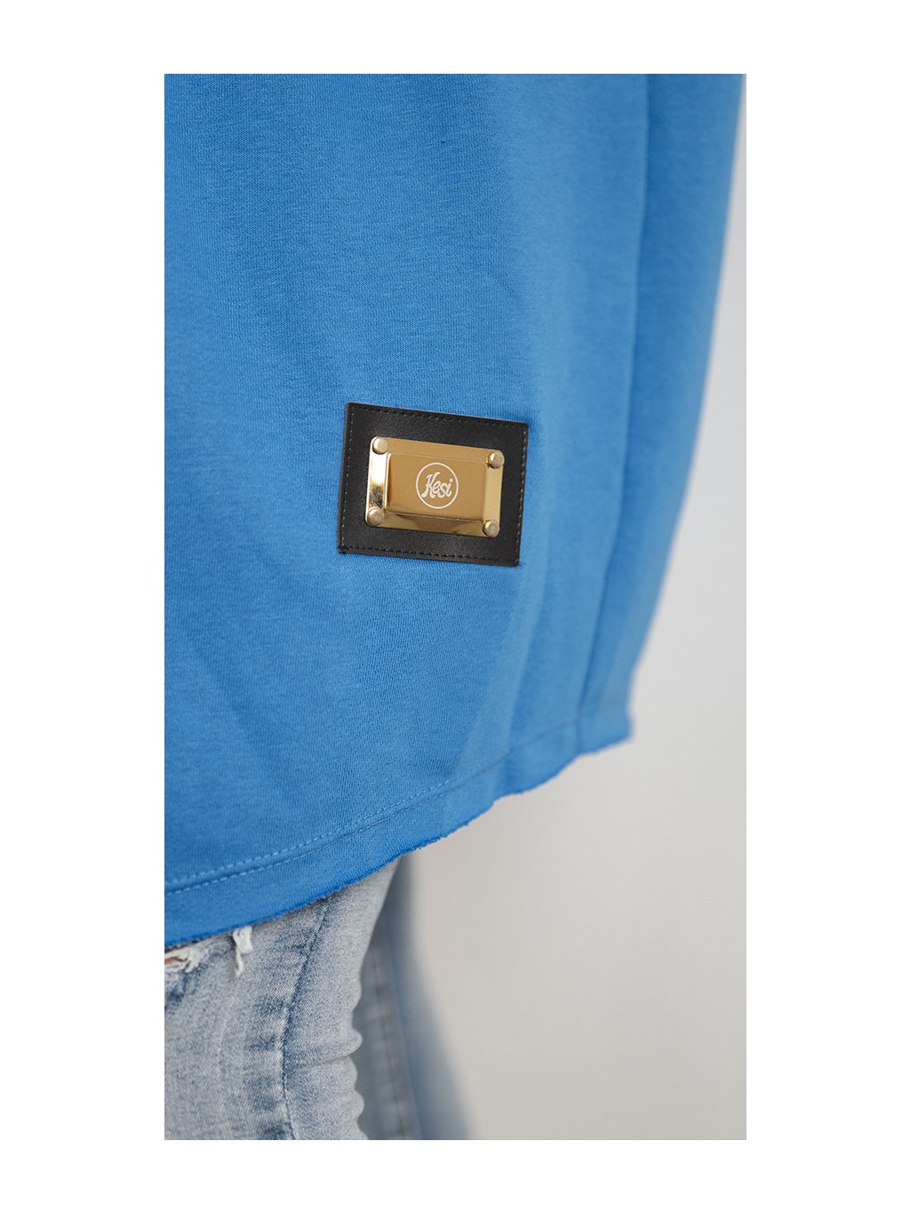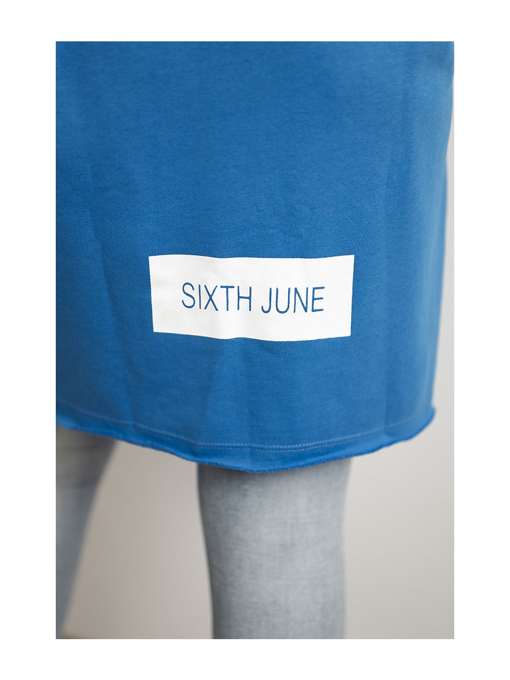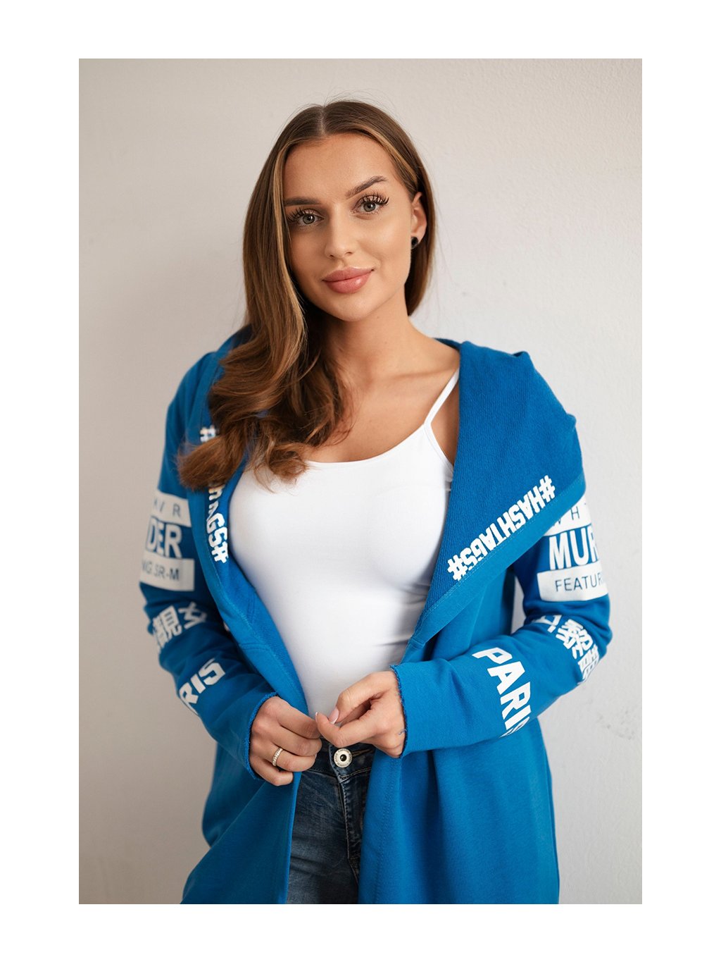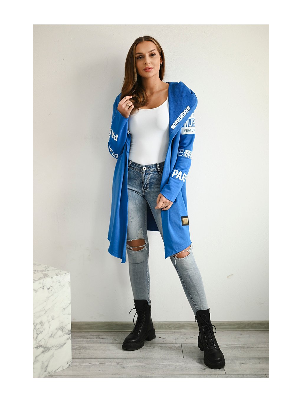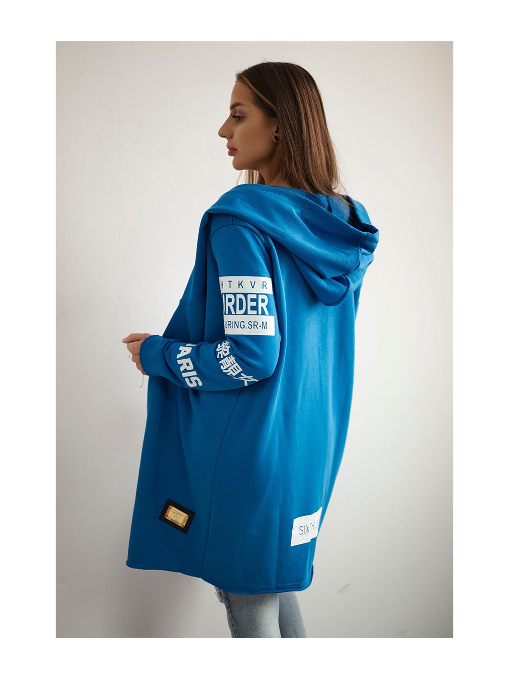 Modrý dámský kardigan s nápisy a kapucí