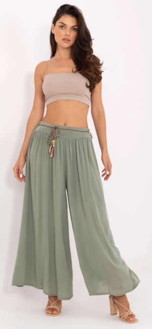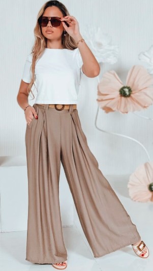 - Khaki široké kalhoty s boho páskem, tělový crop top bez ramínek, béžové sandálky na podpatku