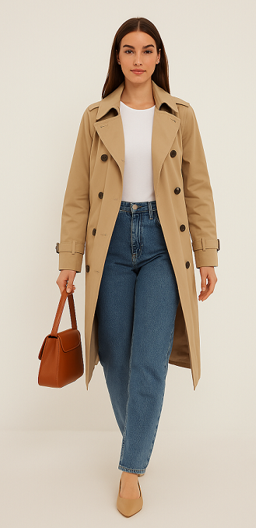 🔸 Rovné džíny + bílé triko + béžový trenčkot + kožená kabelka v karamelovém odstínu