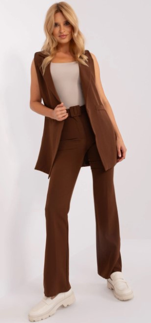 🔸 Kalhotový kostým v hnědé nebo tmavě modré + hedvábná blůza + kožená kabelka se strukturou
