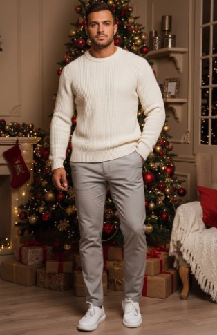 Vánoce nejsou jen o svetrech – dobře padnoucí kalhoty podtrhnou celkový vzhled a hodí se jak ke slavnostní košili, tak k volnějšímu svetru. Letos vynikají kalhoty z jemného manšestru, vlněné směsi nebo měkčí tvíd. Vhodné jsou tlumené barvy jako tmavě zelená, vínová, oříšková nebo klasická tmavě šedá.
