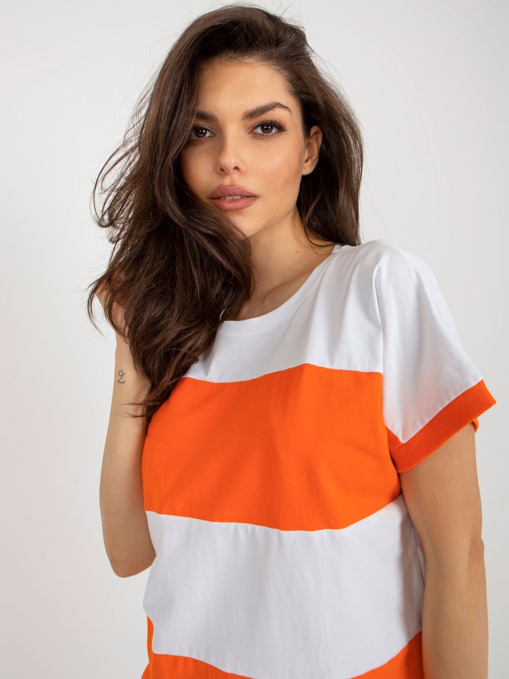 Modelka na obrázcích je vysoká 173 cm, obvod přes prsa 85 cm, obvod pasu 62 cm a boky 95 cm.