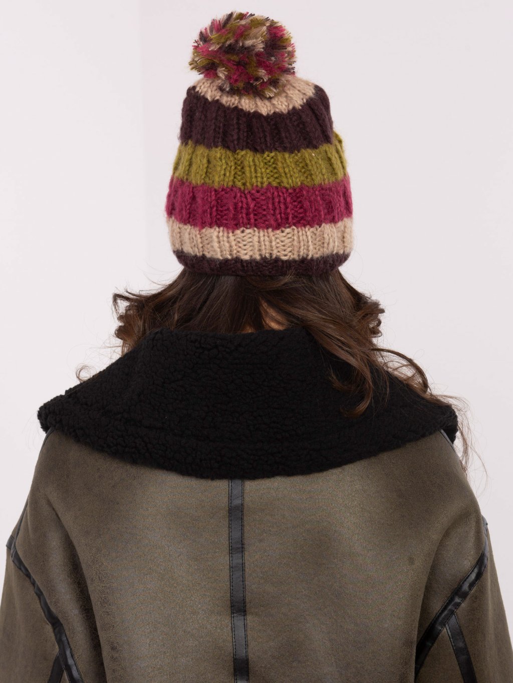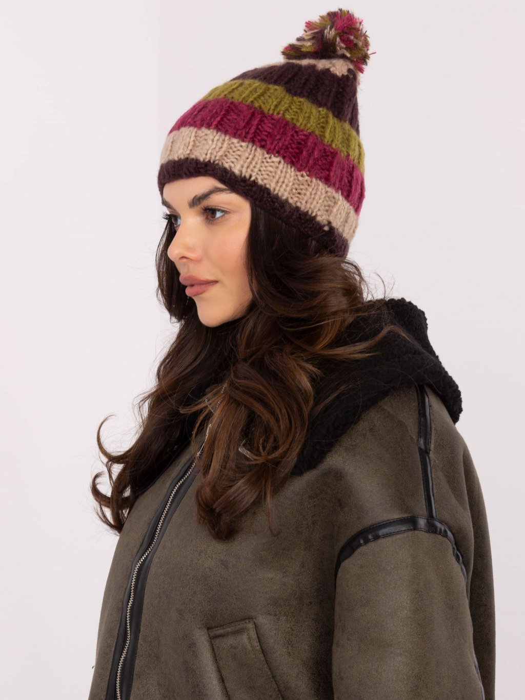 Pruhovaná dámská zimní čepice s bambulí - béžová