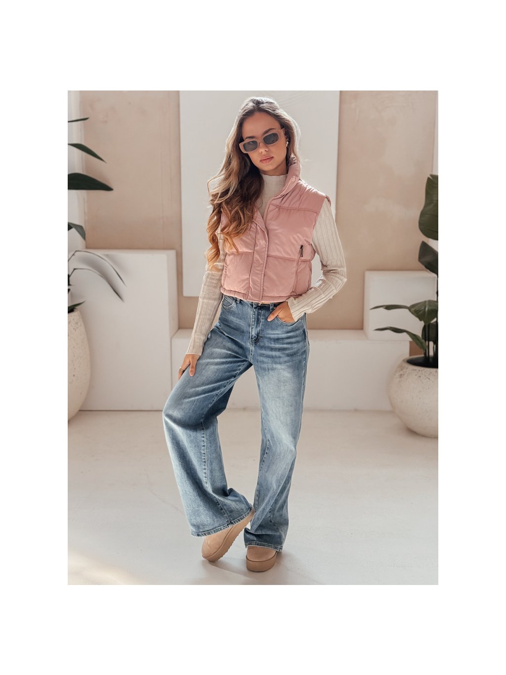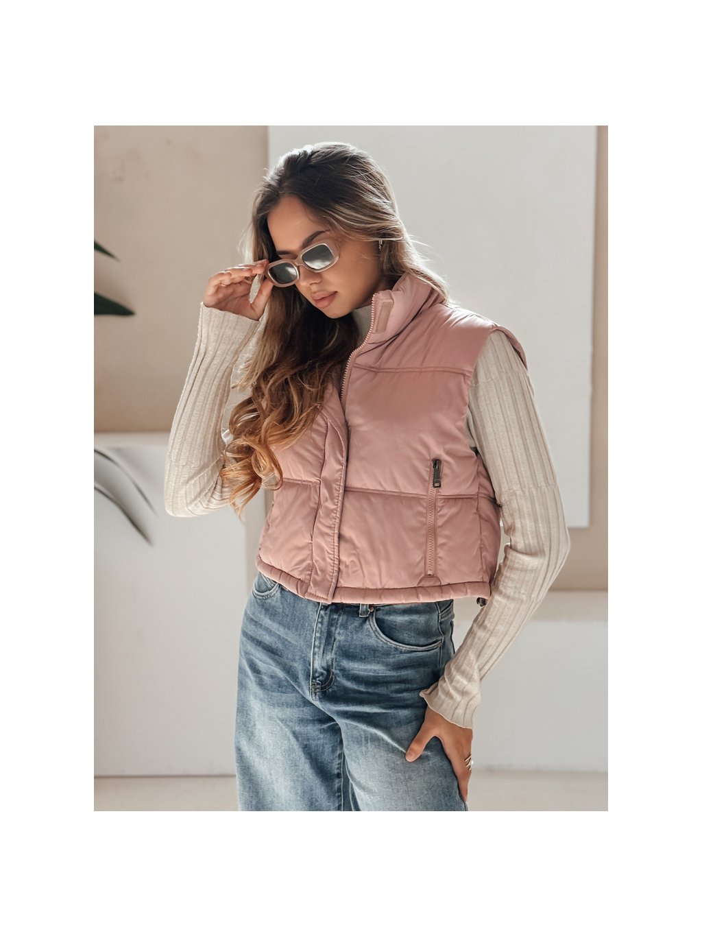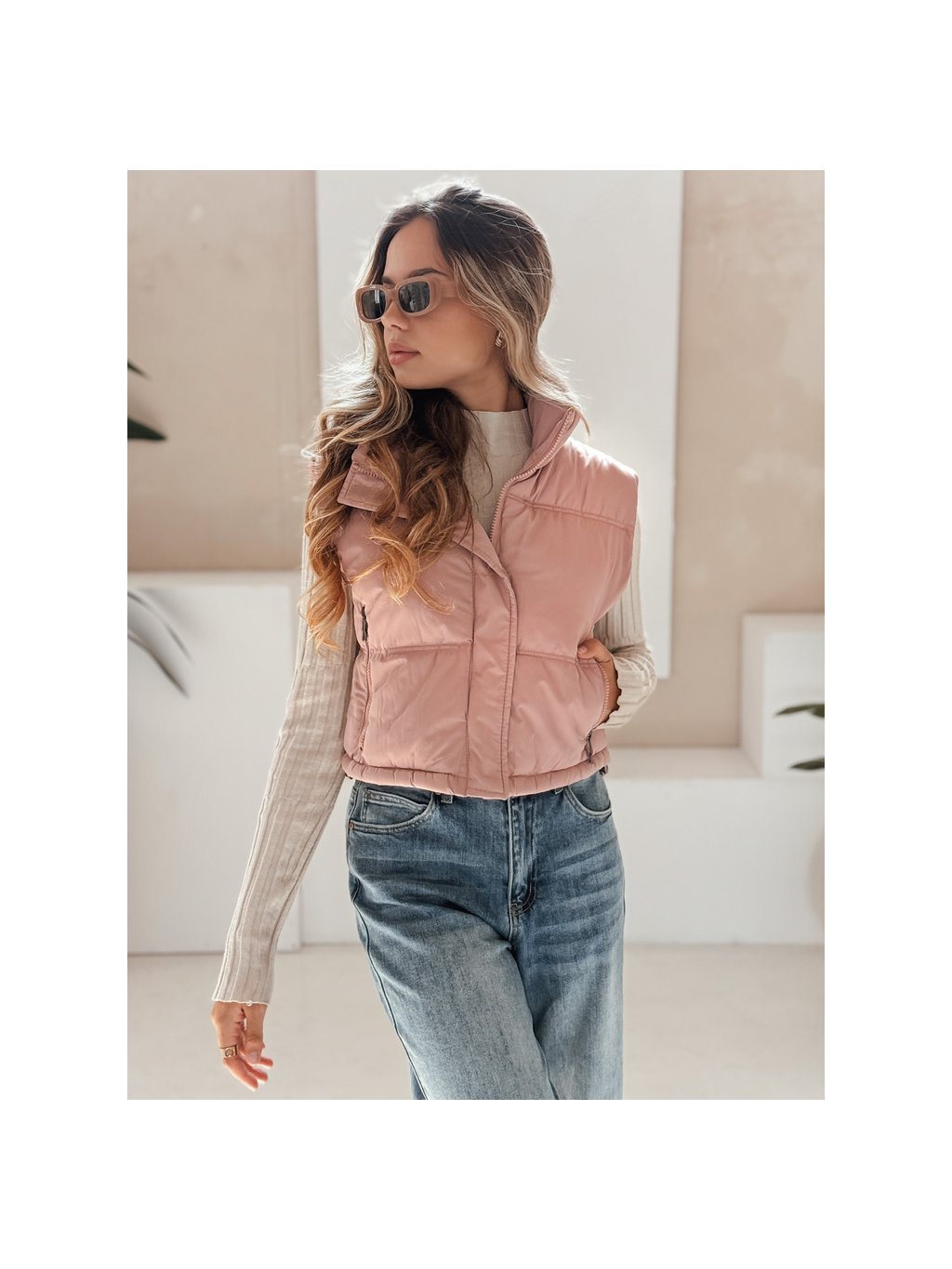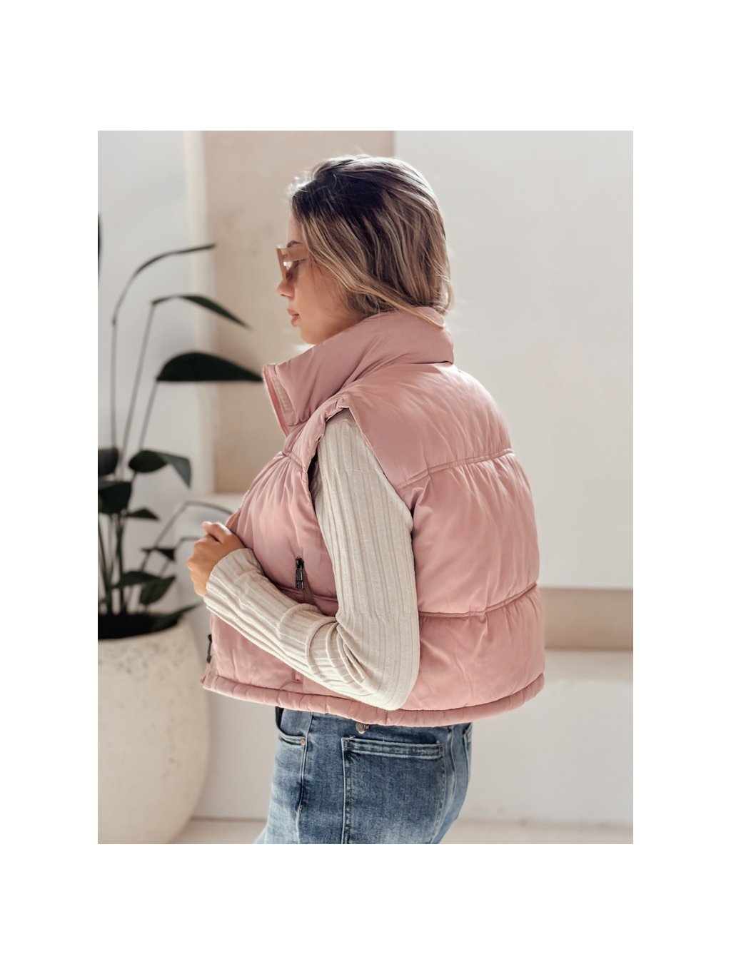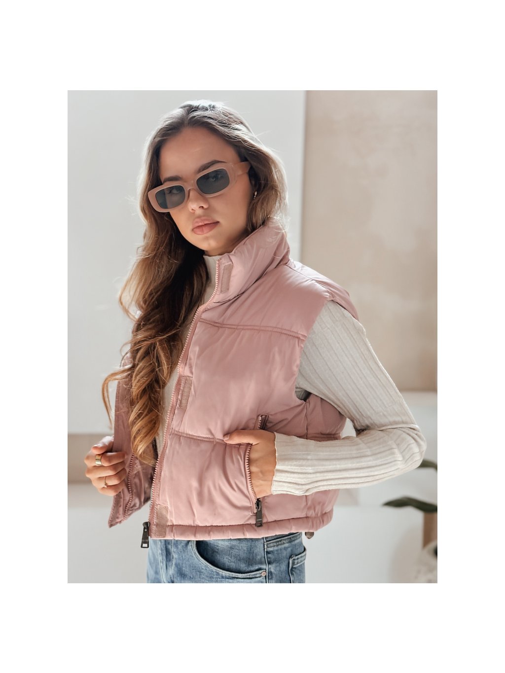 Růžová dámská krátká prošívaná vesta s vysokým límcem