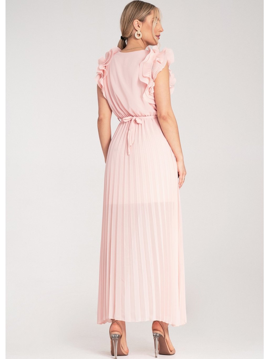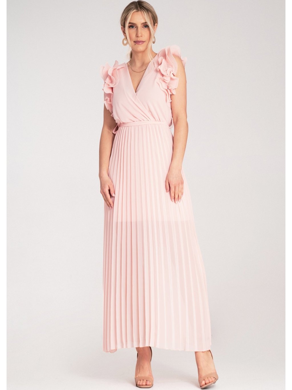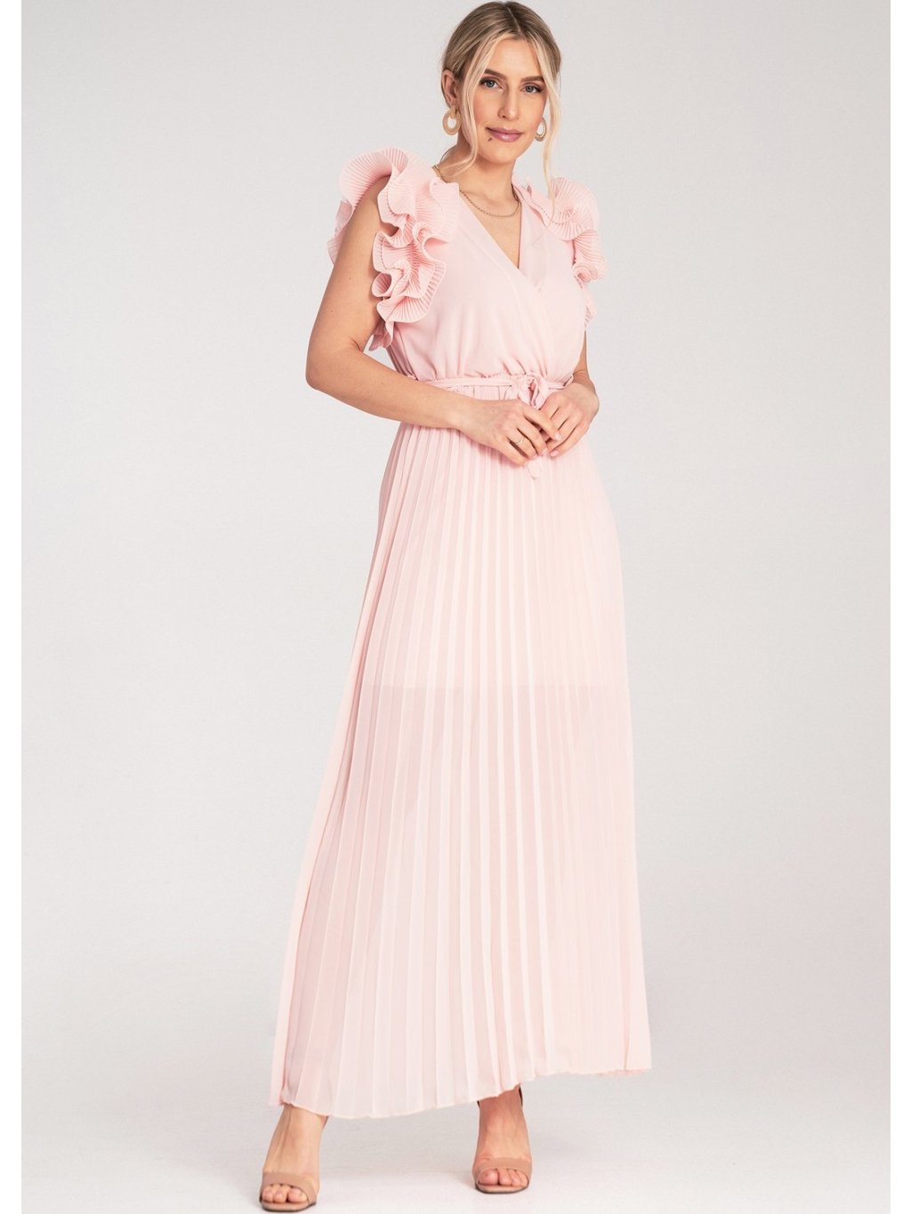 Růžové maxi šaty s výstřihem do V a ozdobnými volánky na ramenou