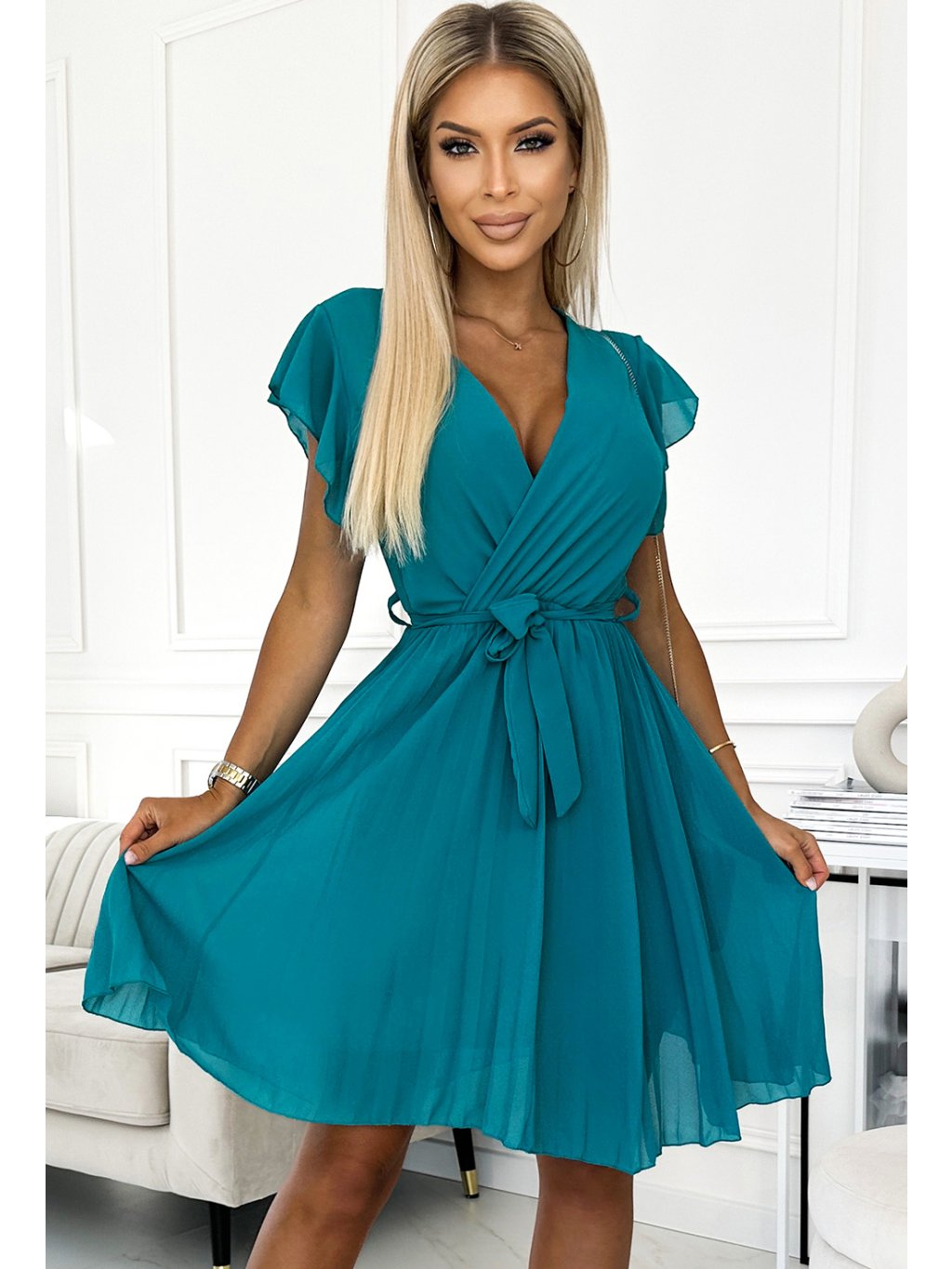 Šifónové modré skládané šaty s výstřihem a volánky CLARISA