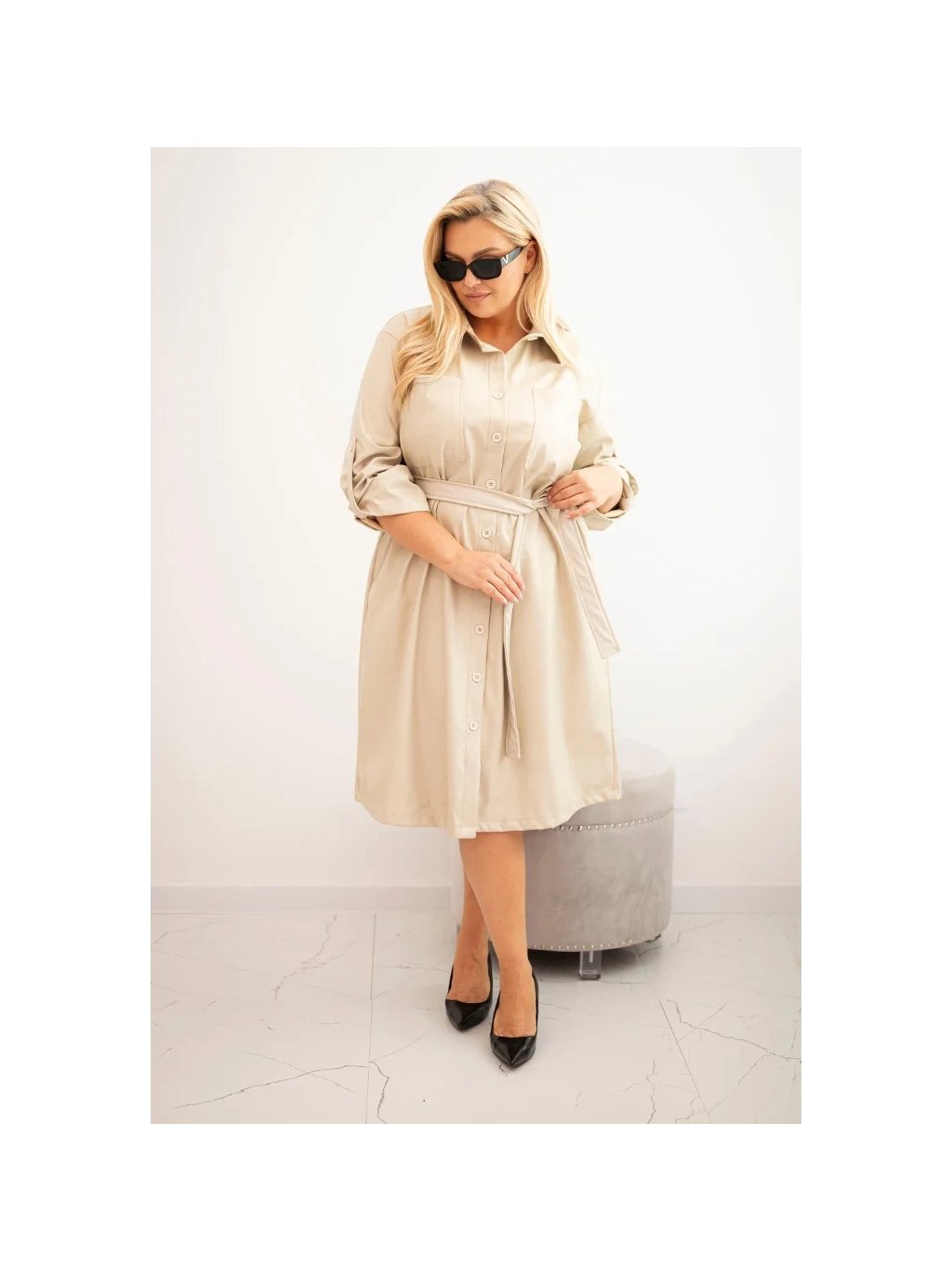 Smetanové koženkové Plus Size šaty s páskem a límečkem