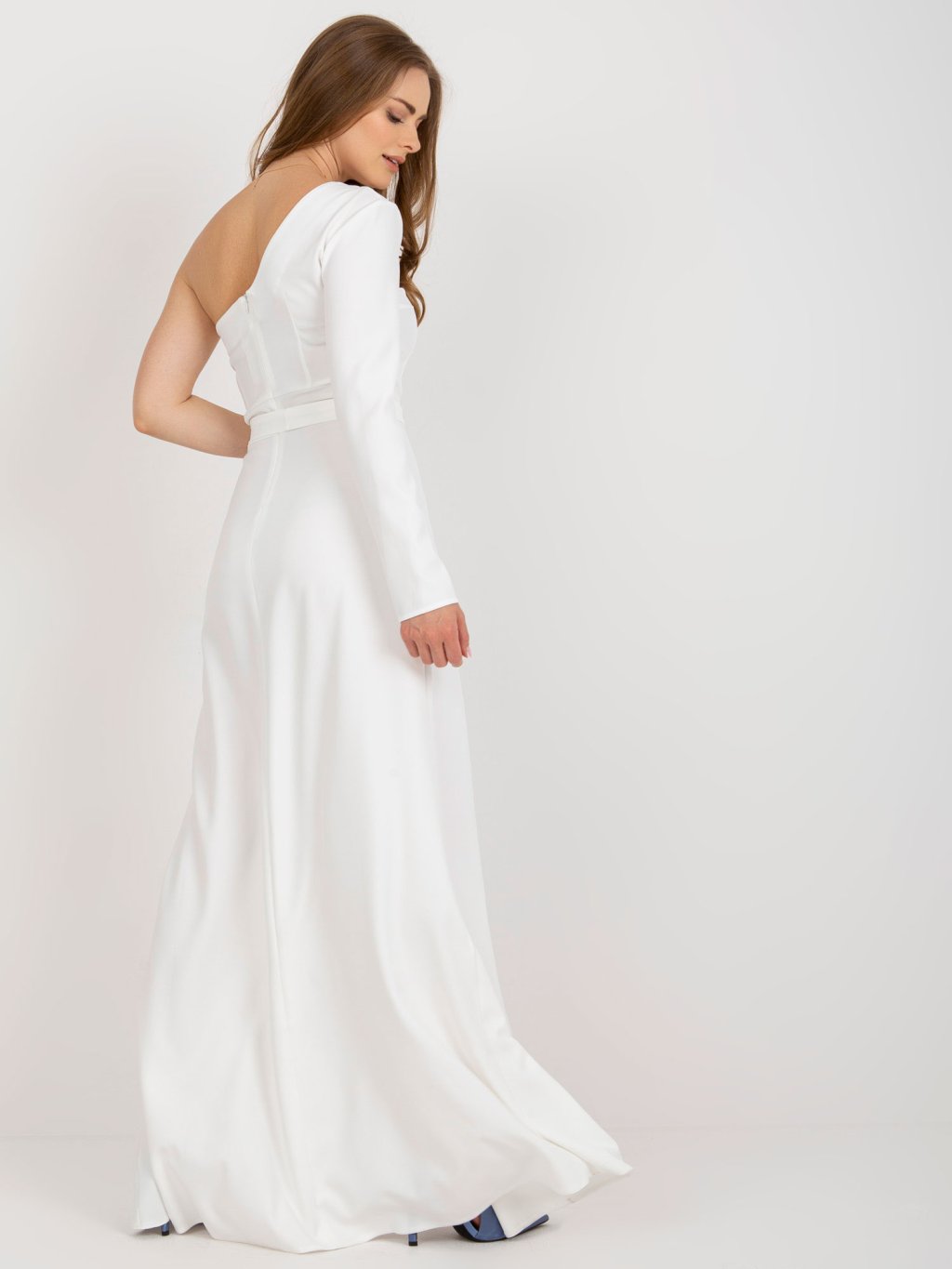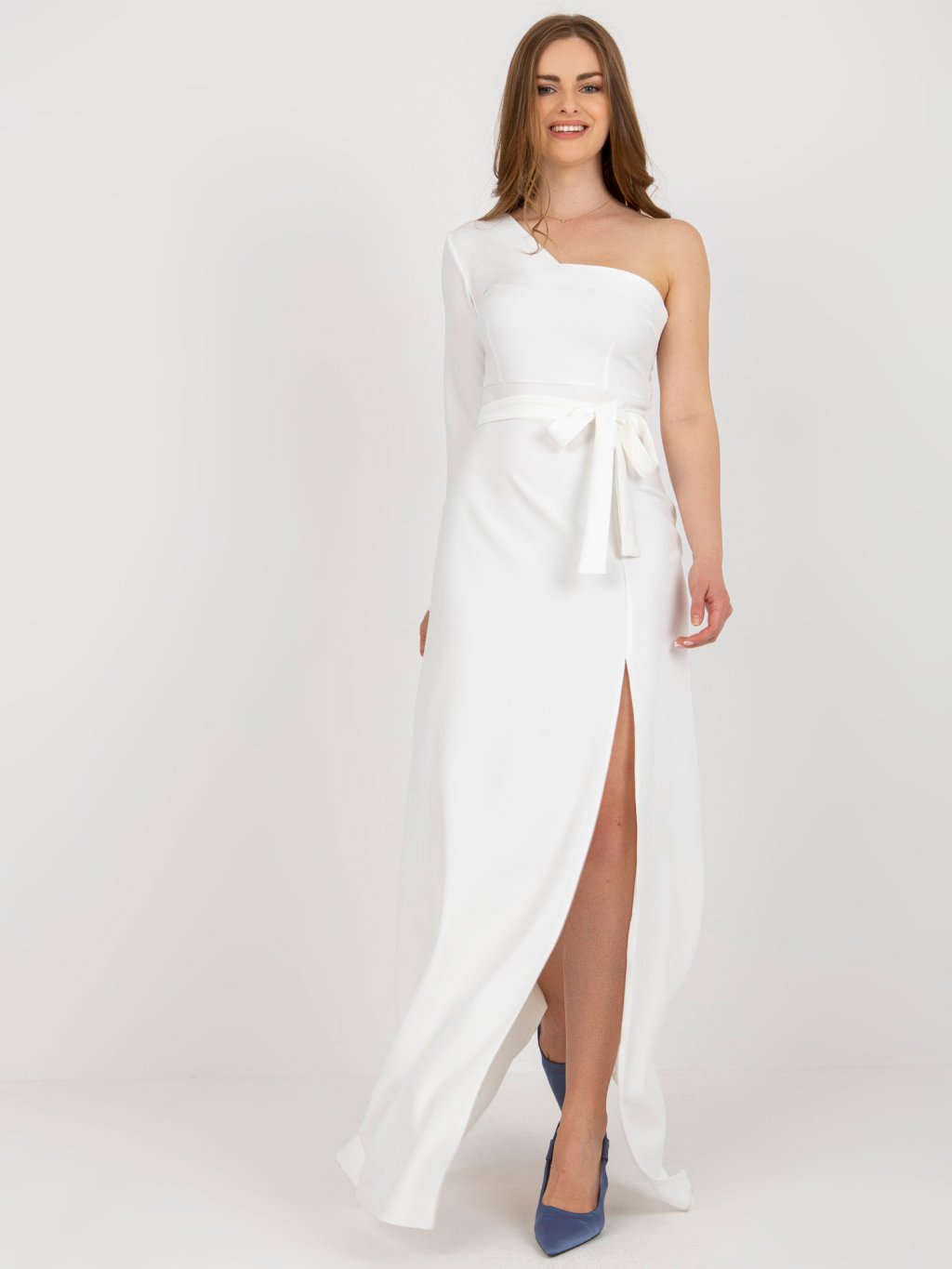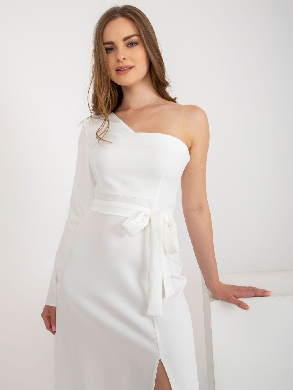 Smetanové večerní maxi šaty na jedno rameno