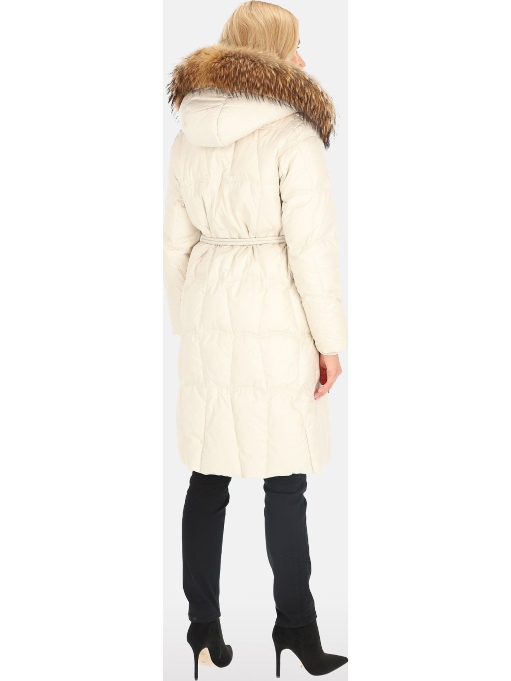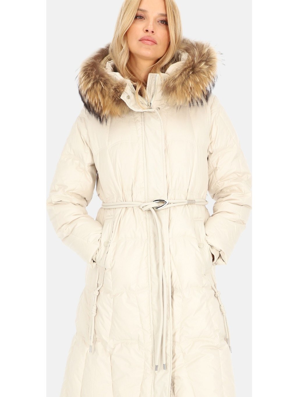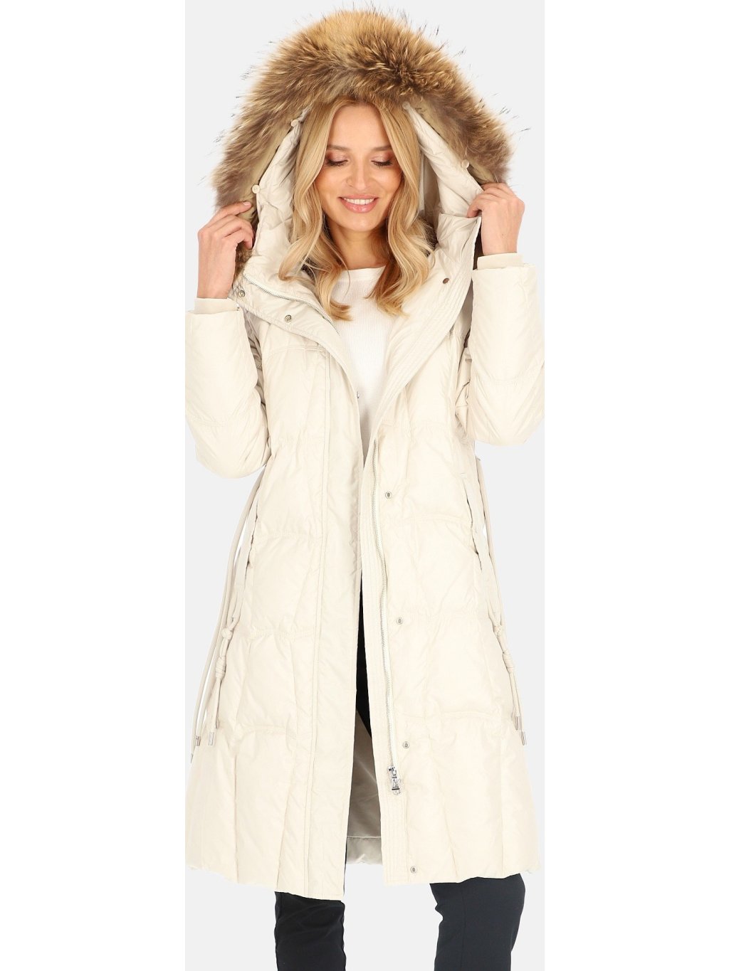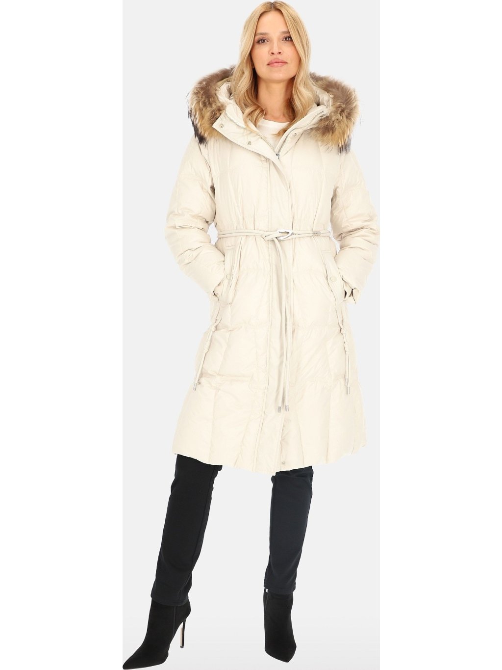 Smetanový dámský péřový kabát s ozdobným páskem