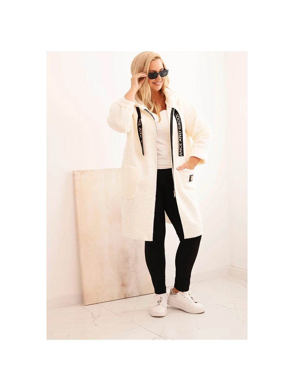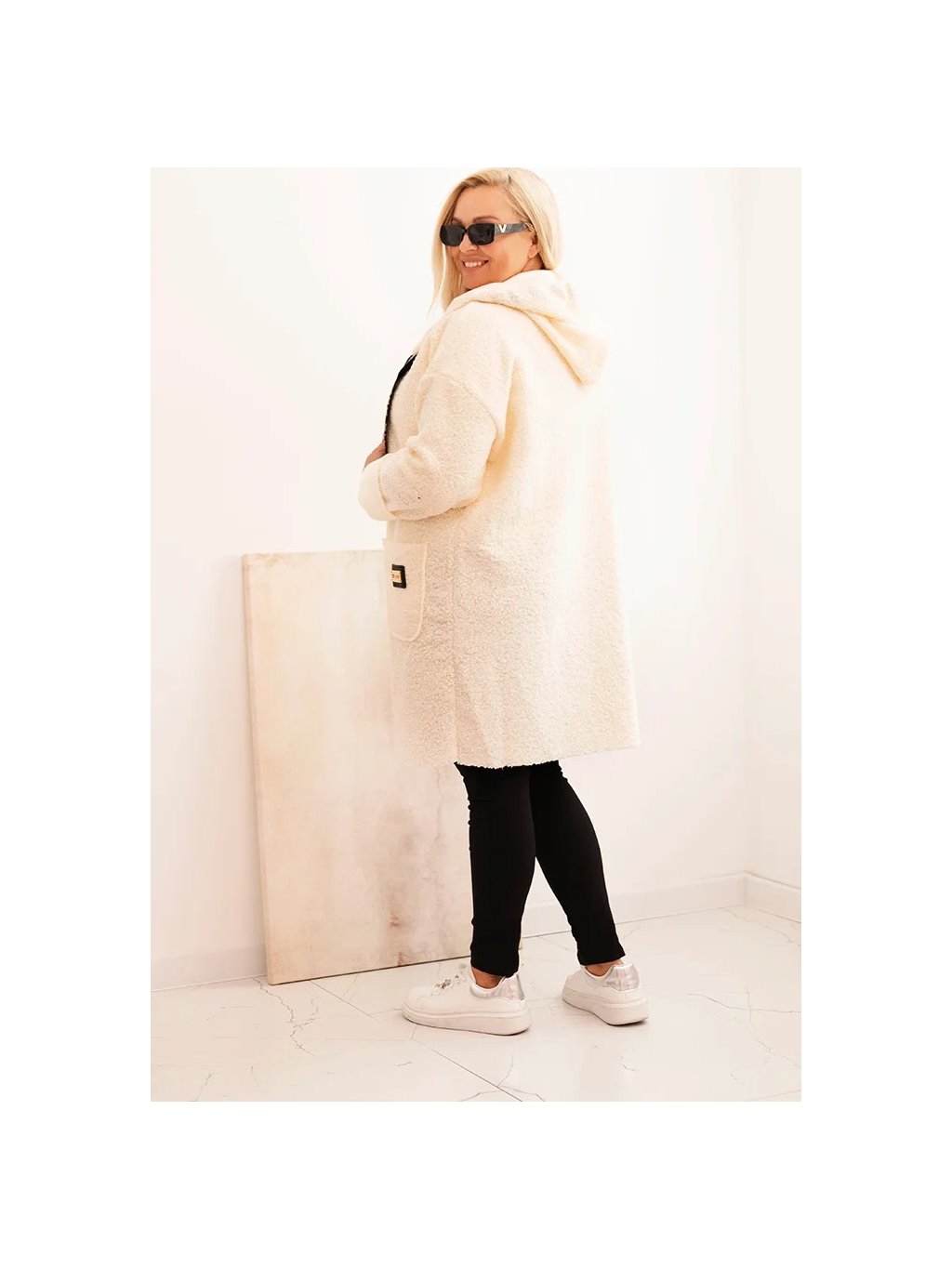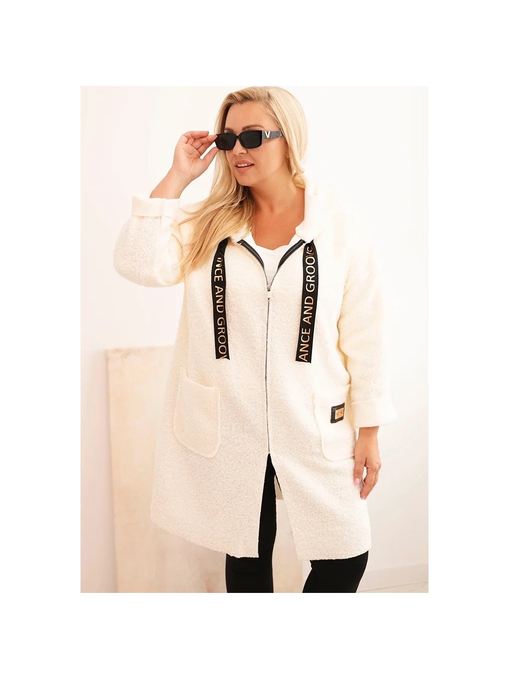 Smetanový stylový dámský plus size teddy kabátek na zip s kapucí