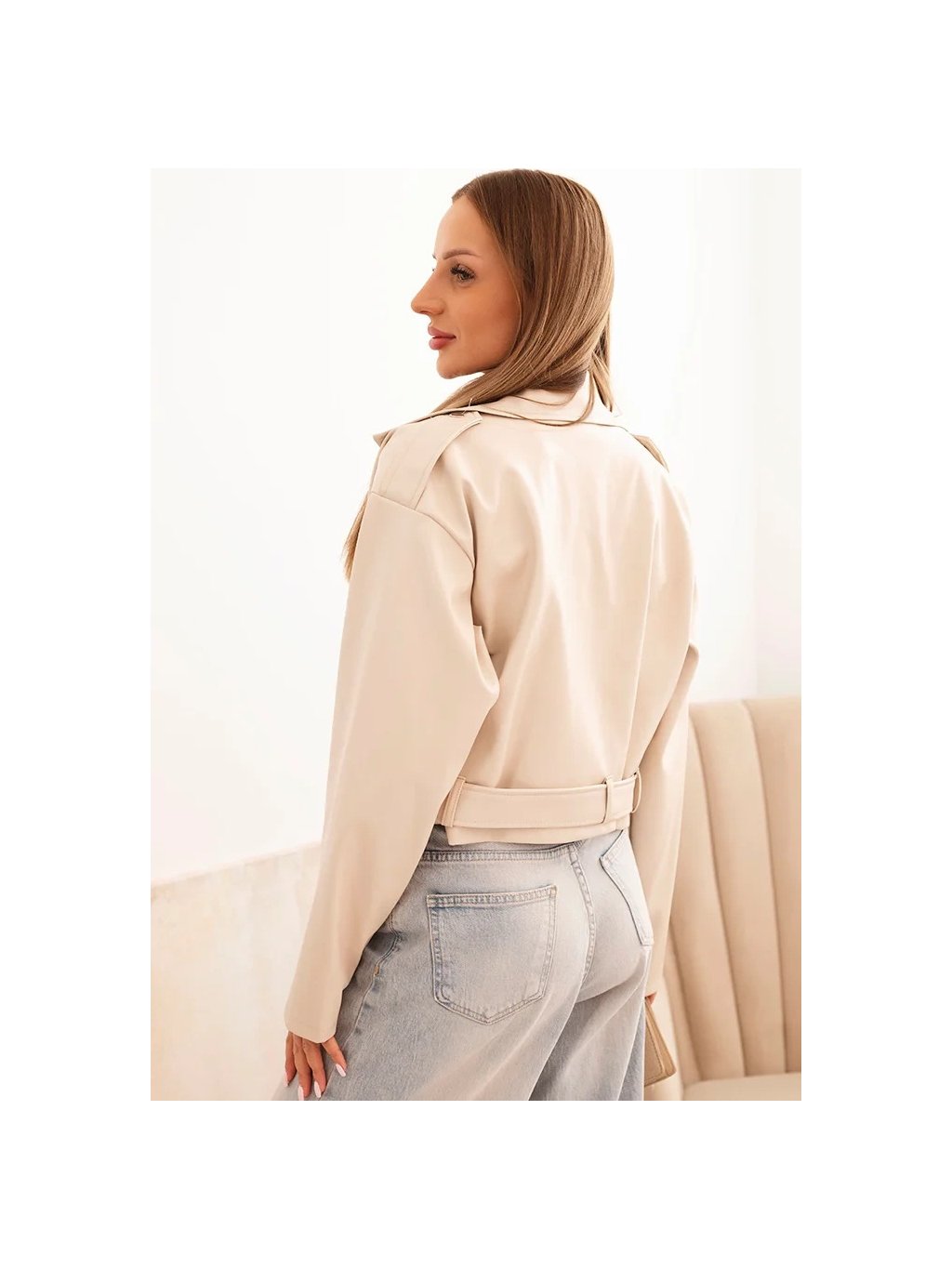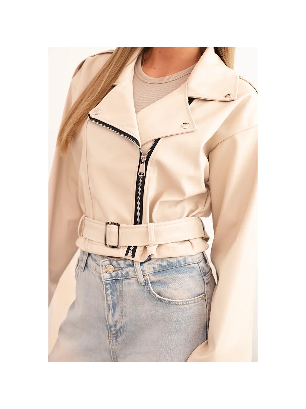 Světle béžová dámská krátká koženková bunda s páskem