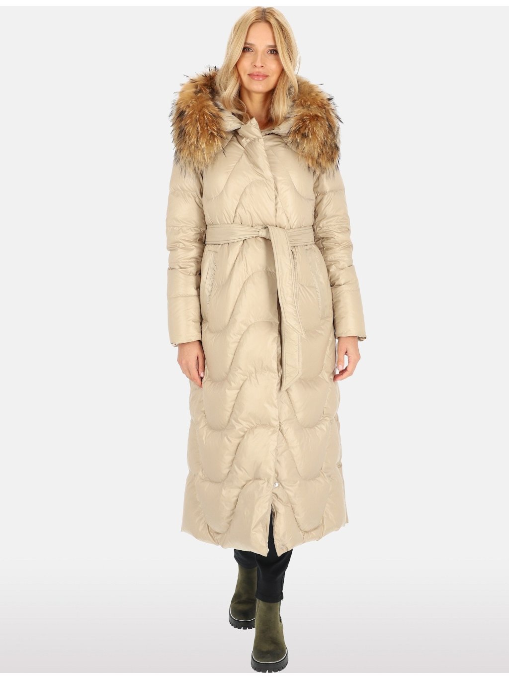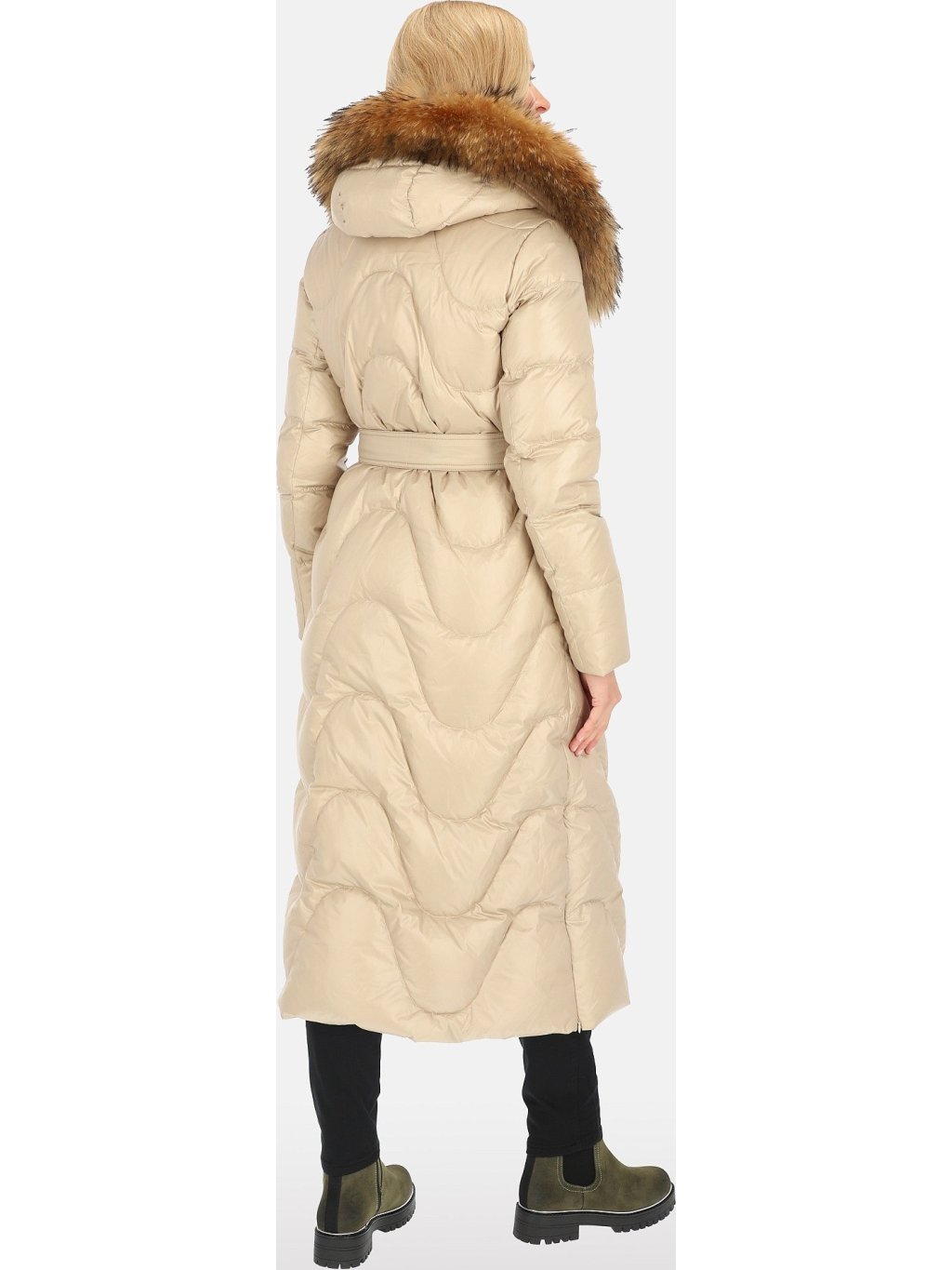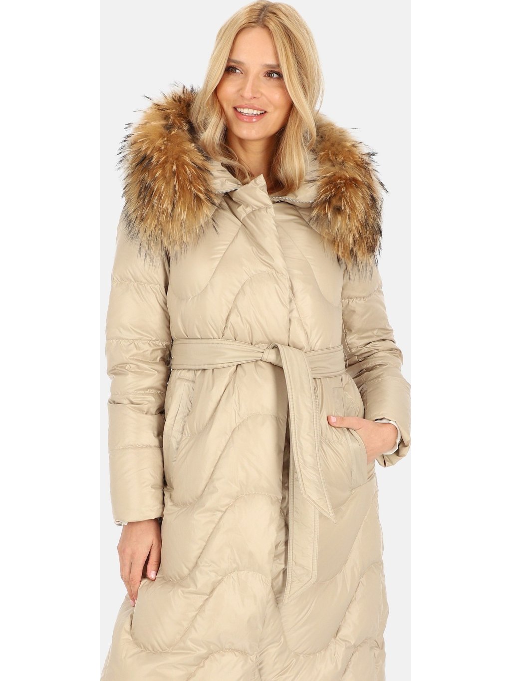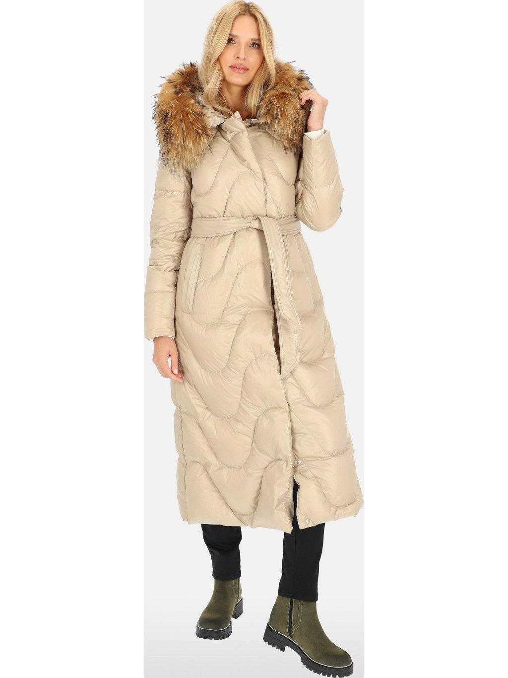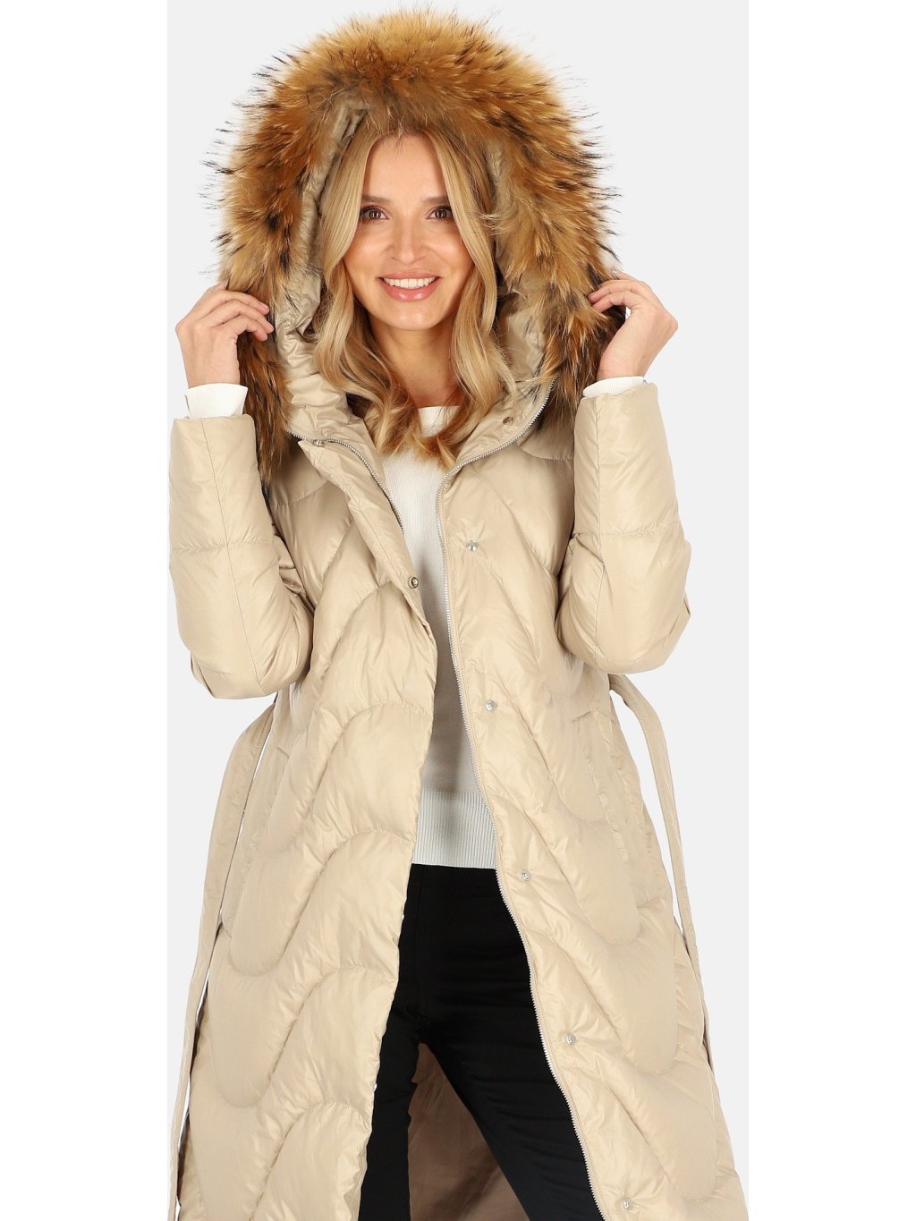 Světle béžový dámský péřový prošívaný kabát