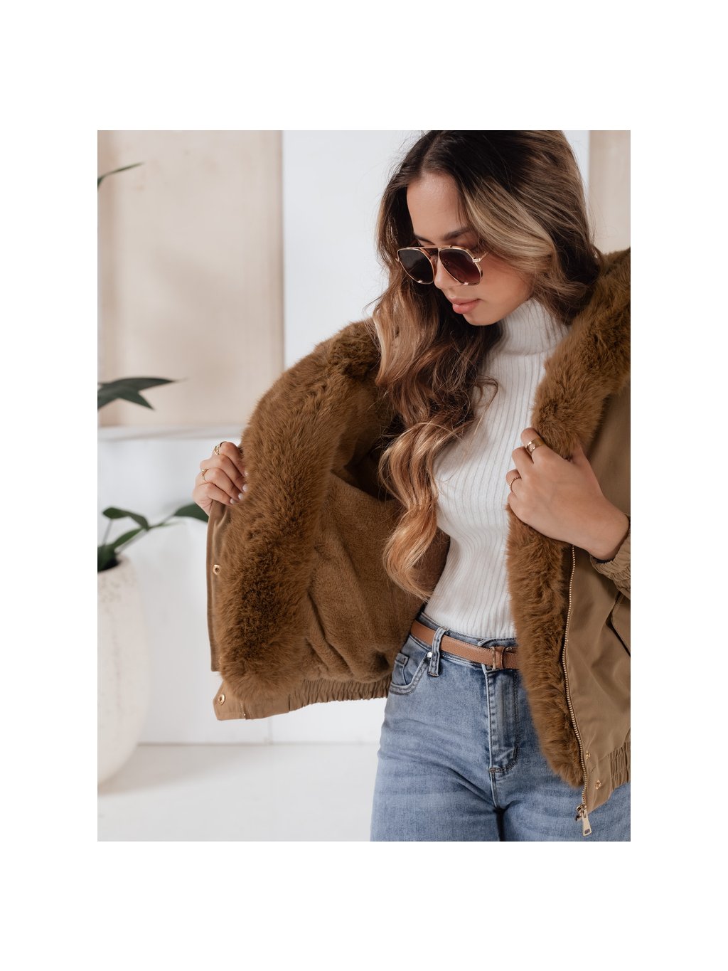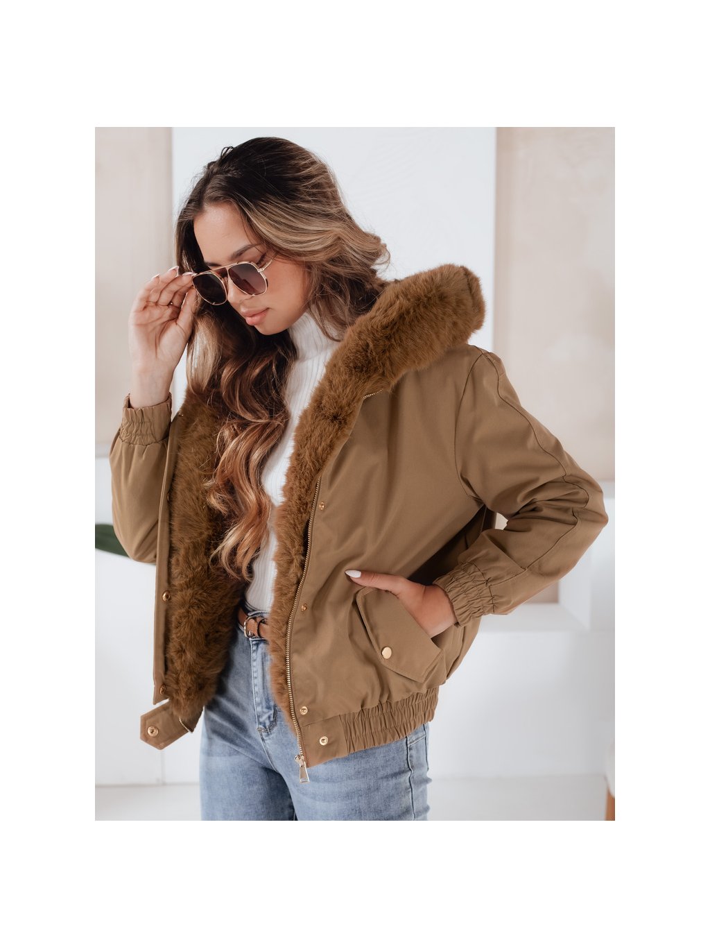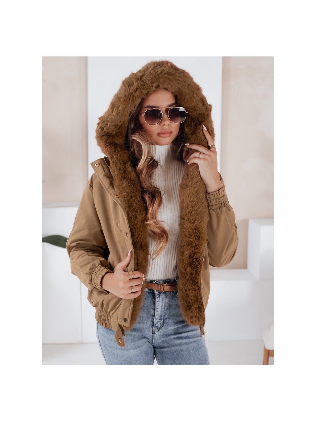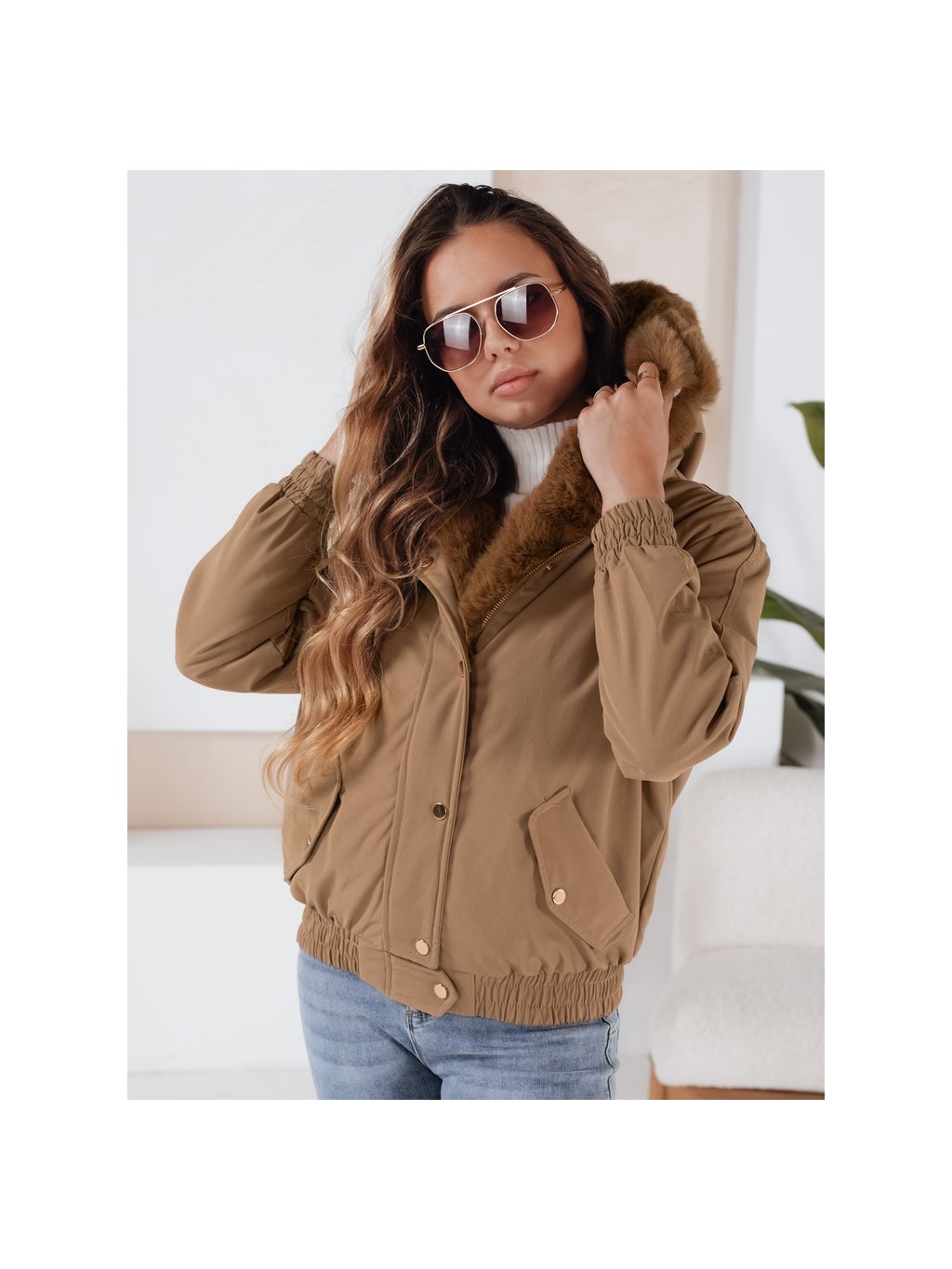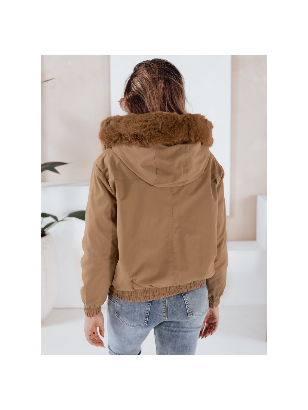 Světle hnědá dámská zimní krátká bunda VESSADA s kožíškem