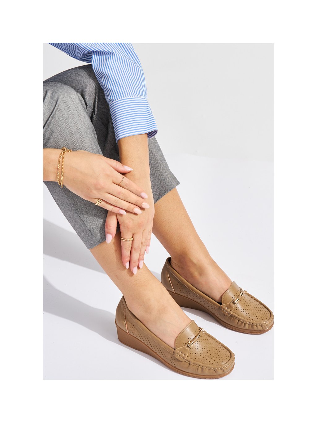 Světle hnědé dírkované mokasíny na nízkém klínku