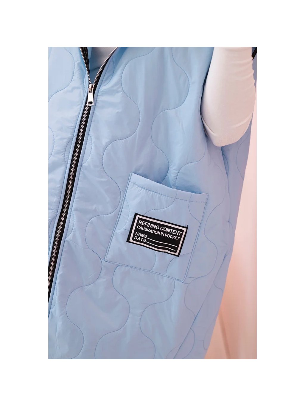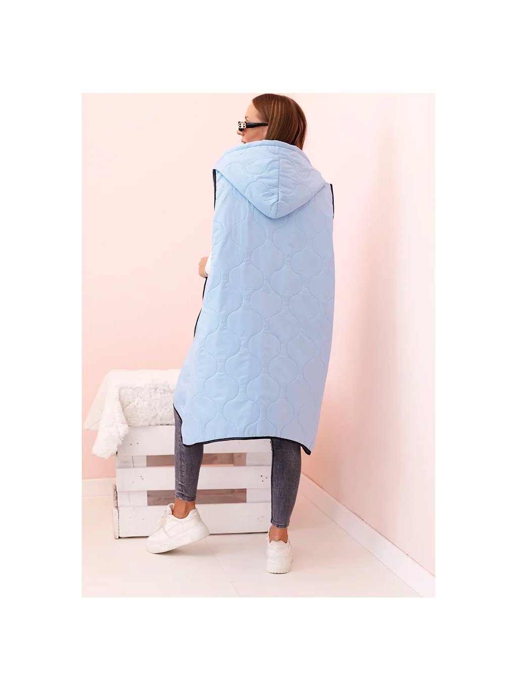 Světle modrá dámská oversize prošívaná vesta s kapucí na zip