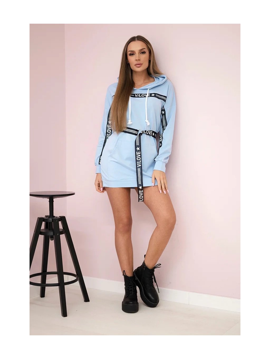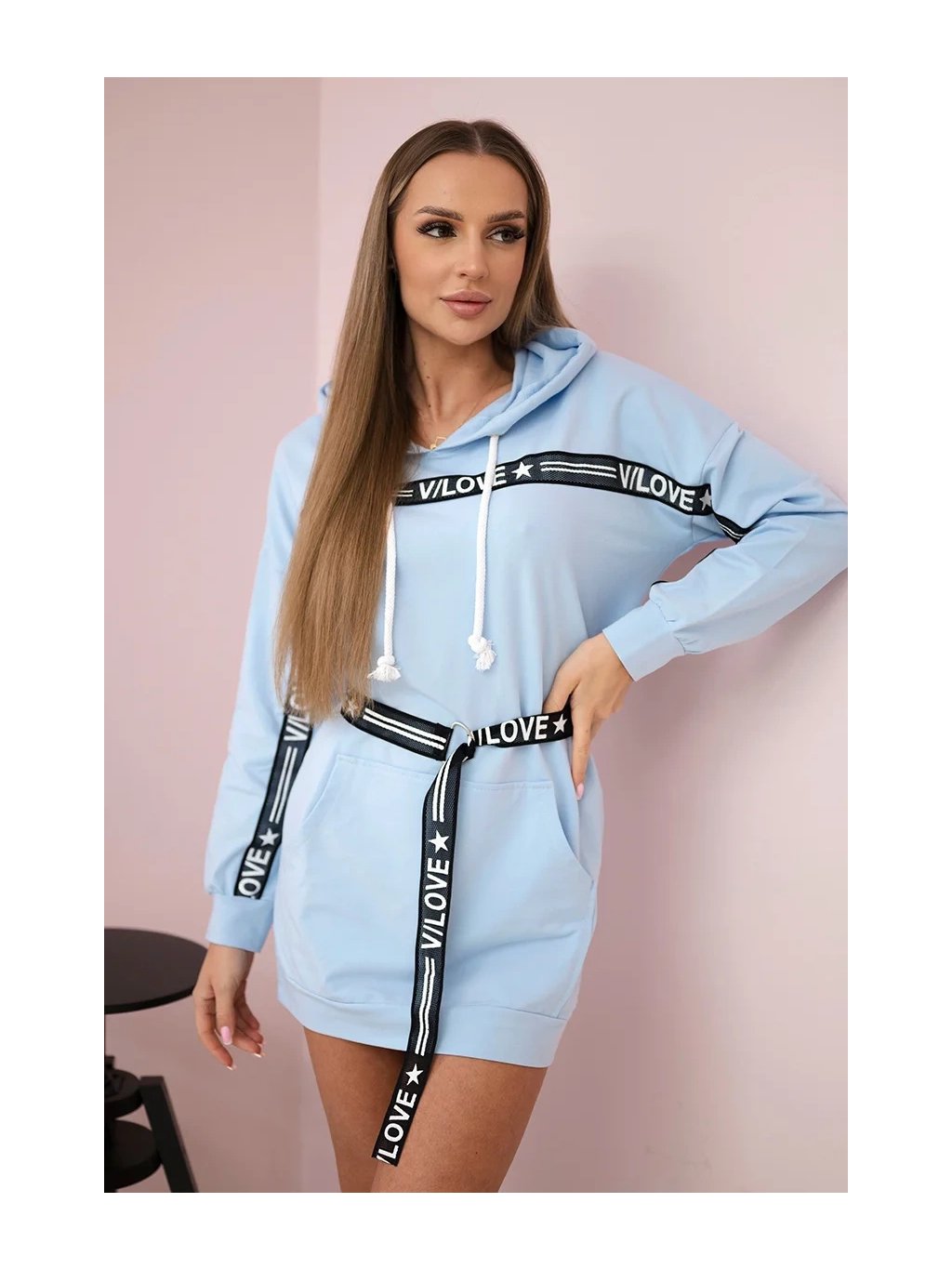Světle modré mikinové šaty s páskem a kapucí