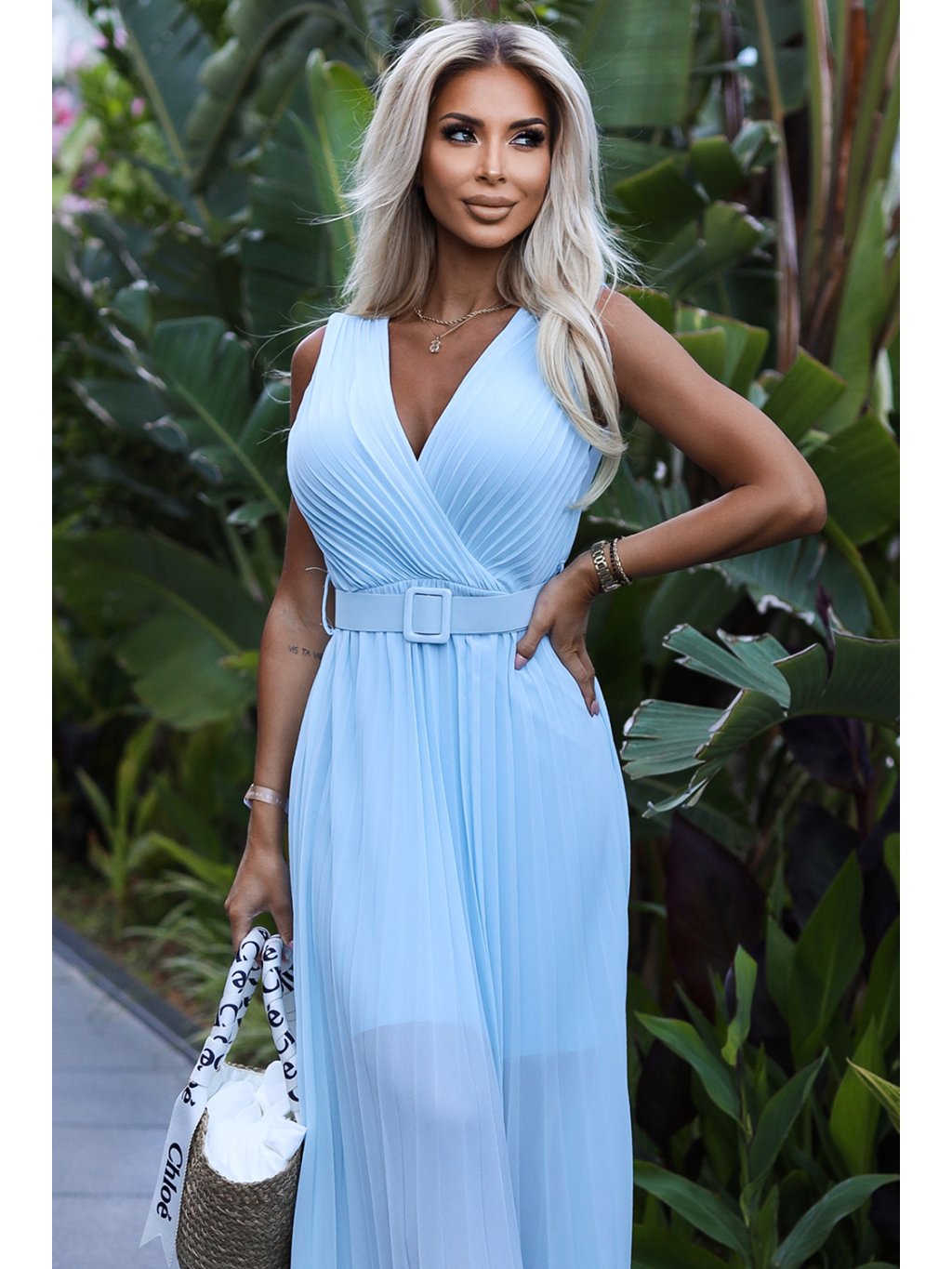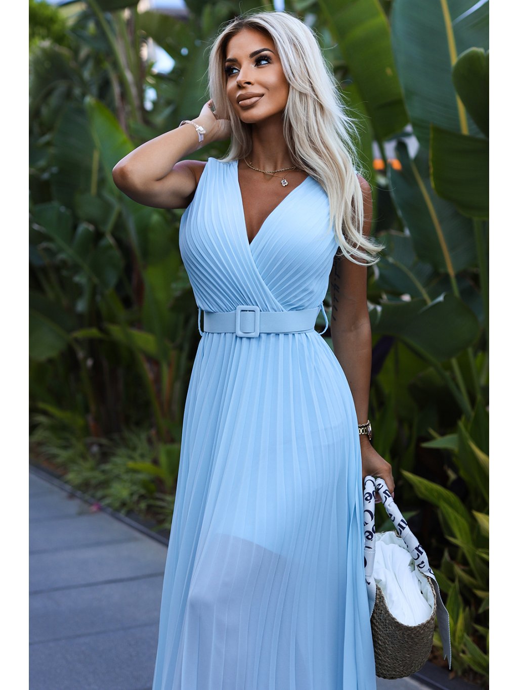 Světle modré plisované šaty s páskem