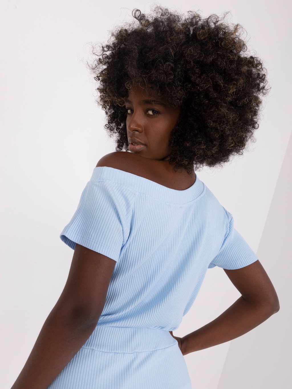 Modelka na obrázcích je vysoká 168 cm, obvod přes prsa 82 cm, obvod pasu 62 cm a boky 93 cm