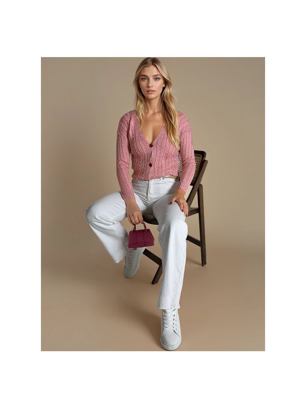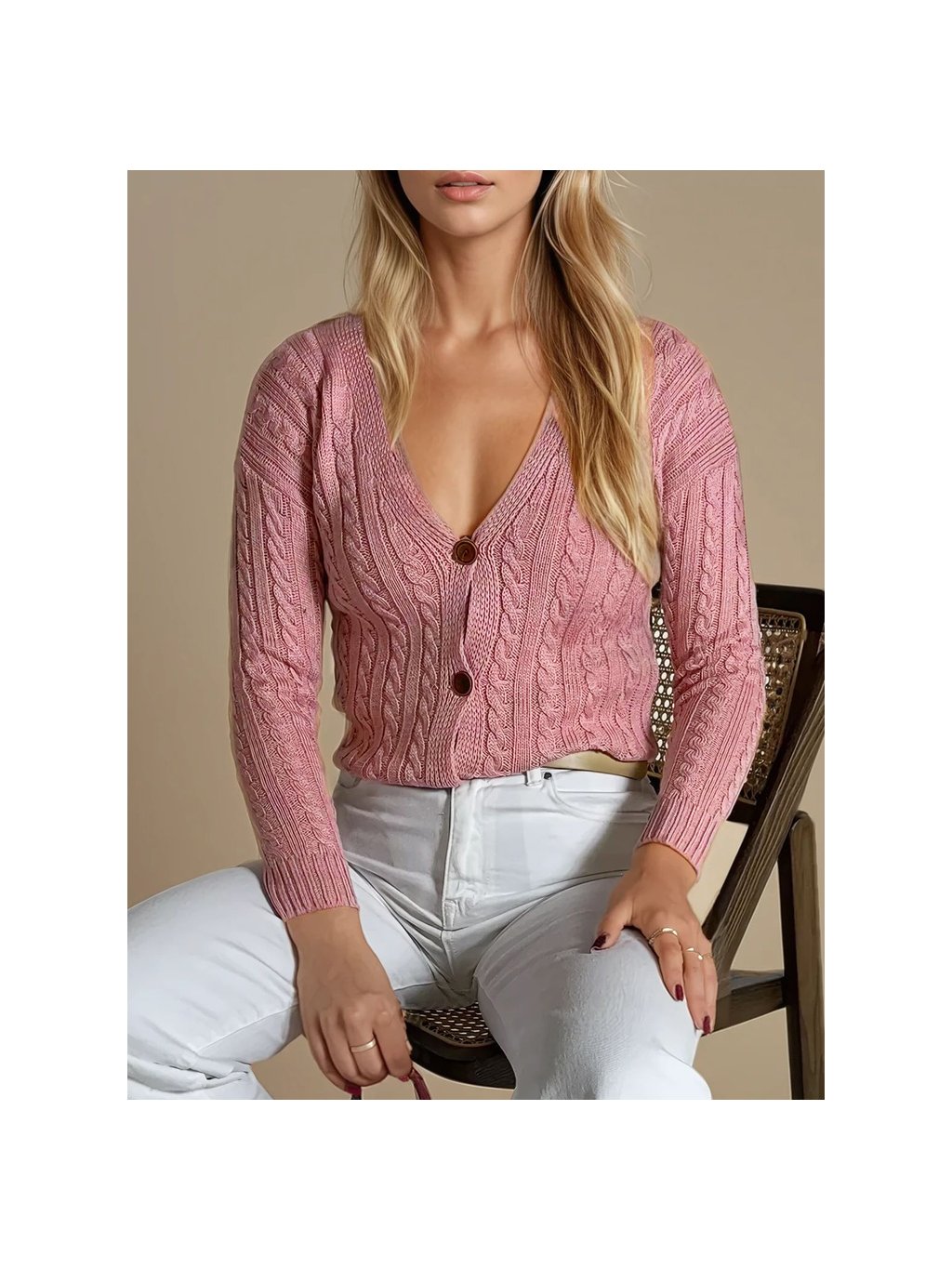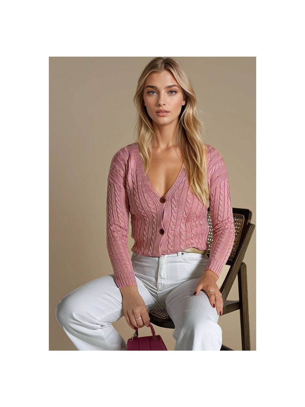 Světle růžový copánkový svetr RIGLA na knoflíky