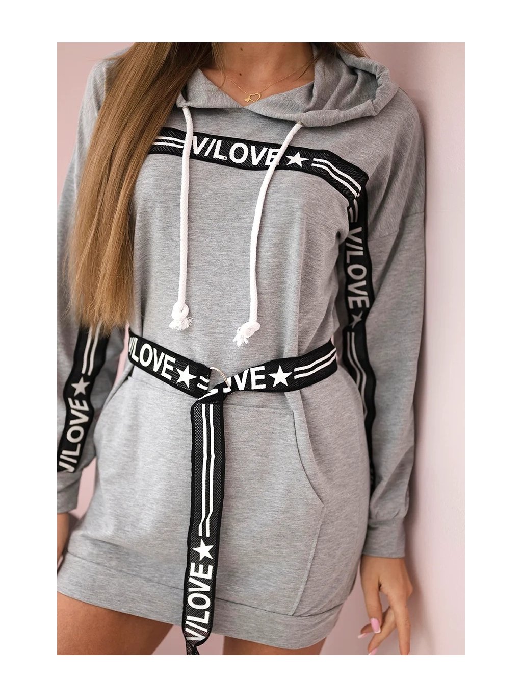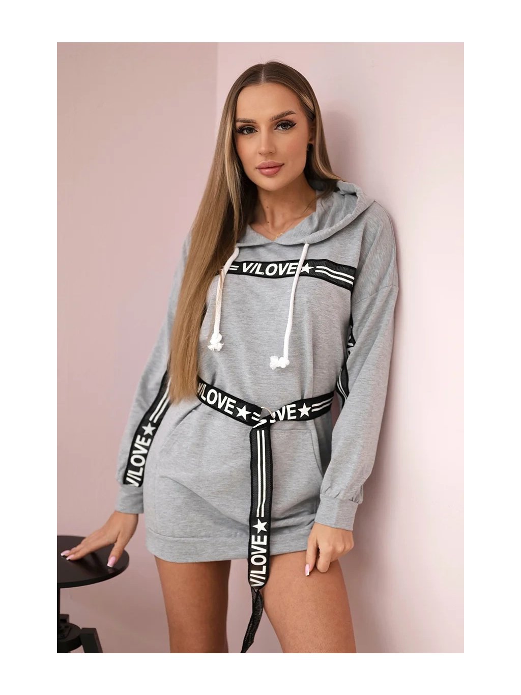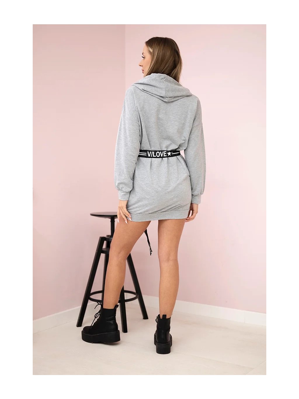 Světle šedé mikinové šaty s páskem a kapucí
