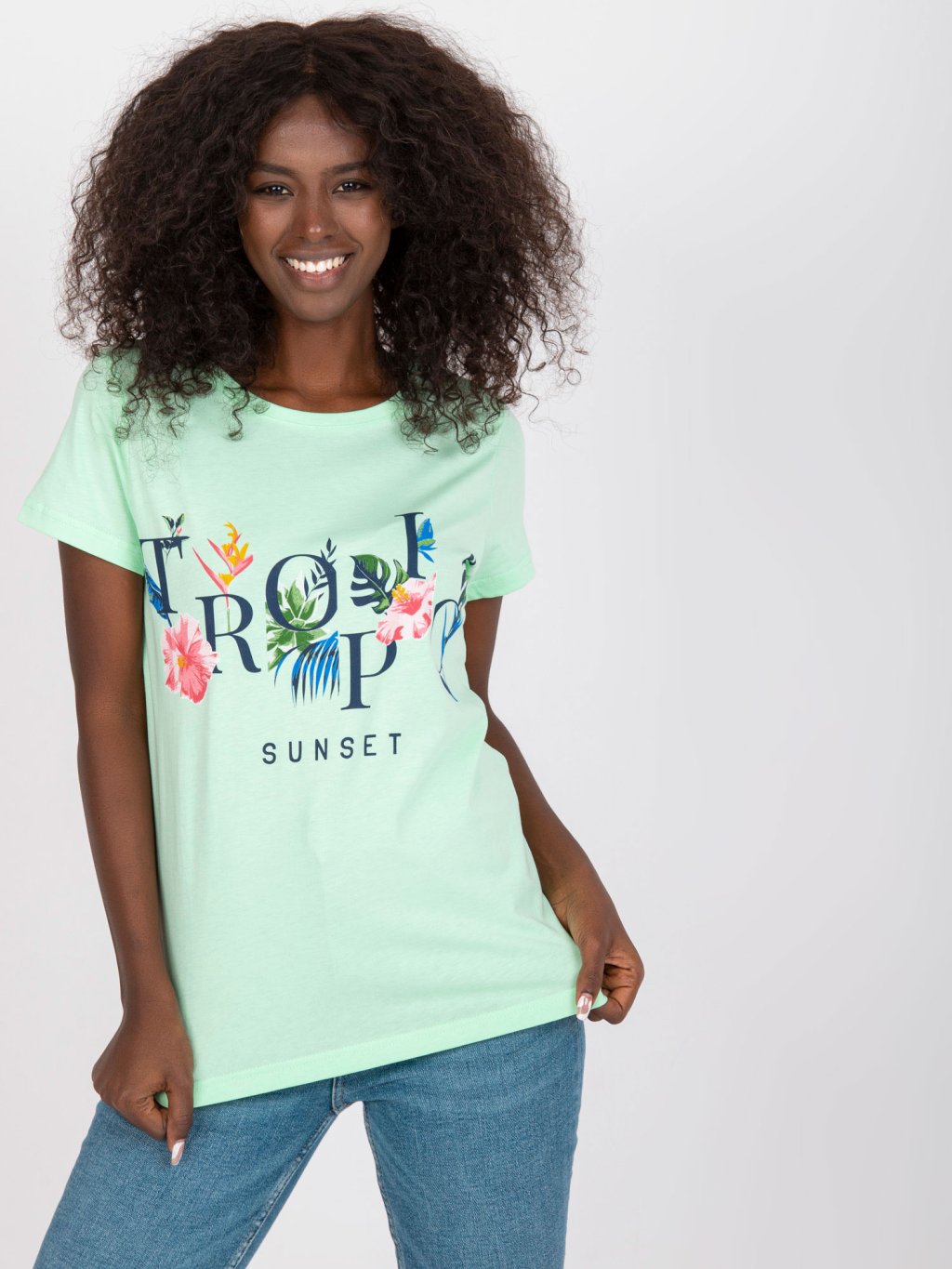 Světle zelené tričko s květinovým potiskem a nápisem "Tropic"