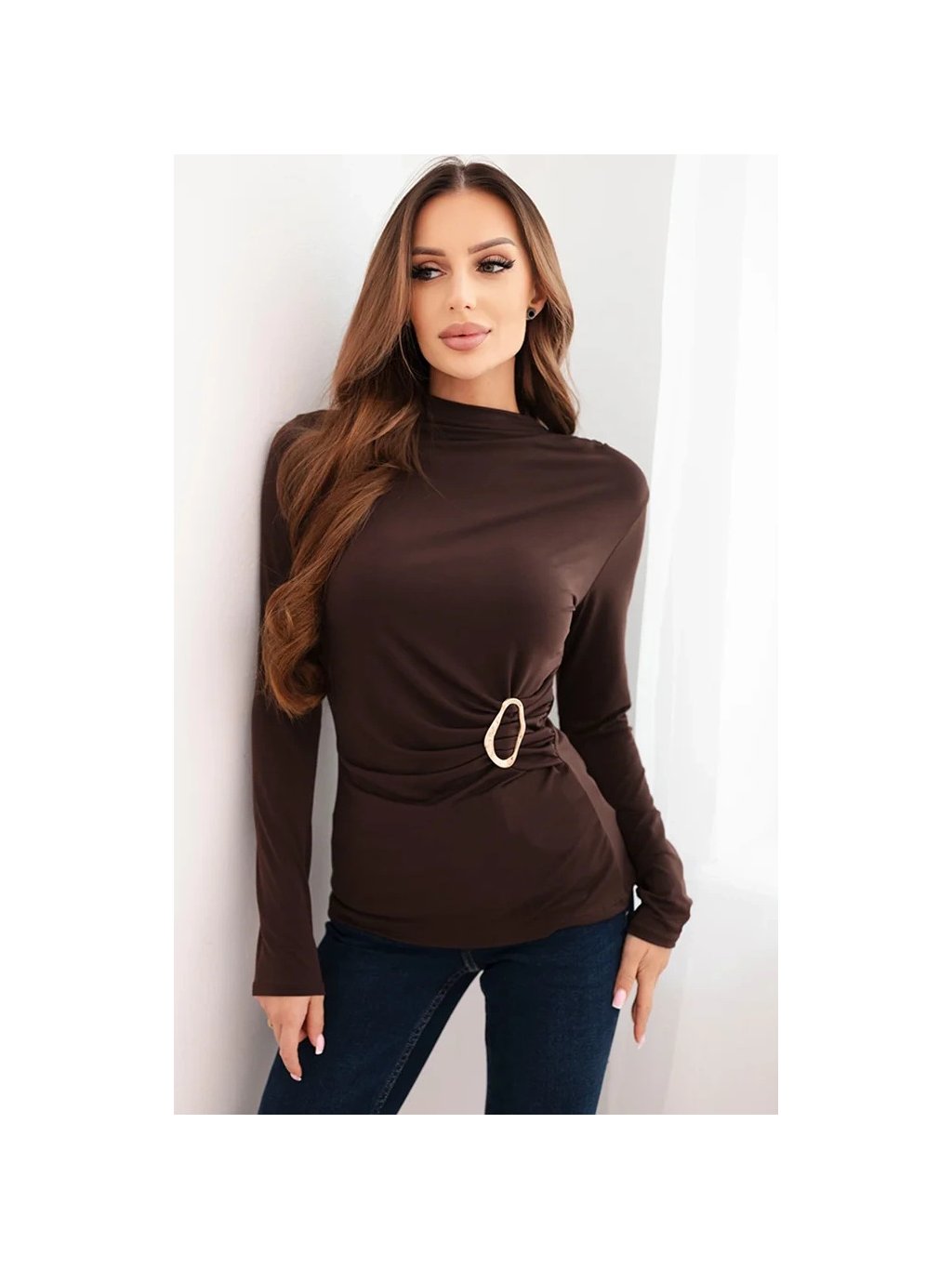 Tmavě hnědá elegantní halenka s řasením a dekorativní sponou