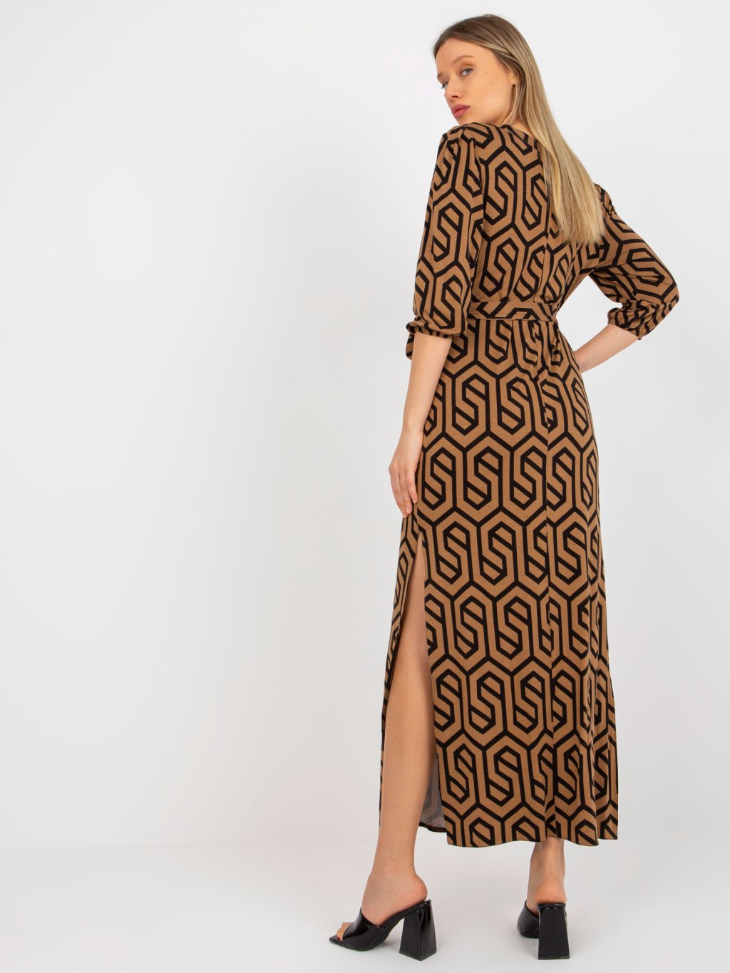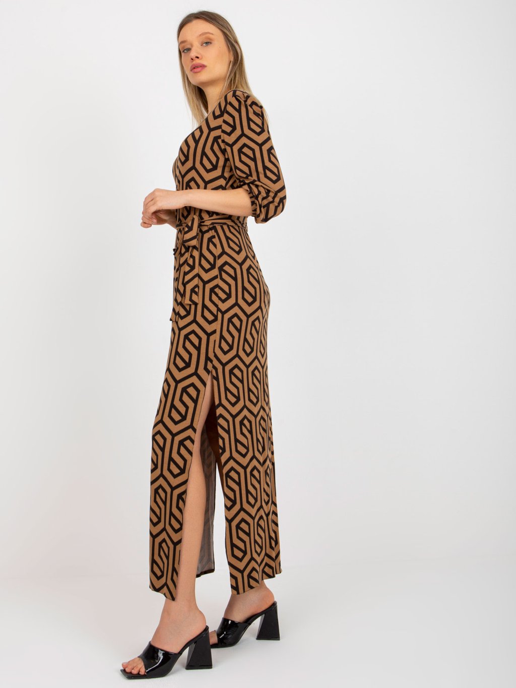 Tmavě hnědé midi šaty se vzorem a rozparky