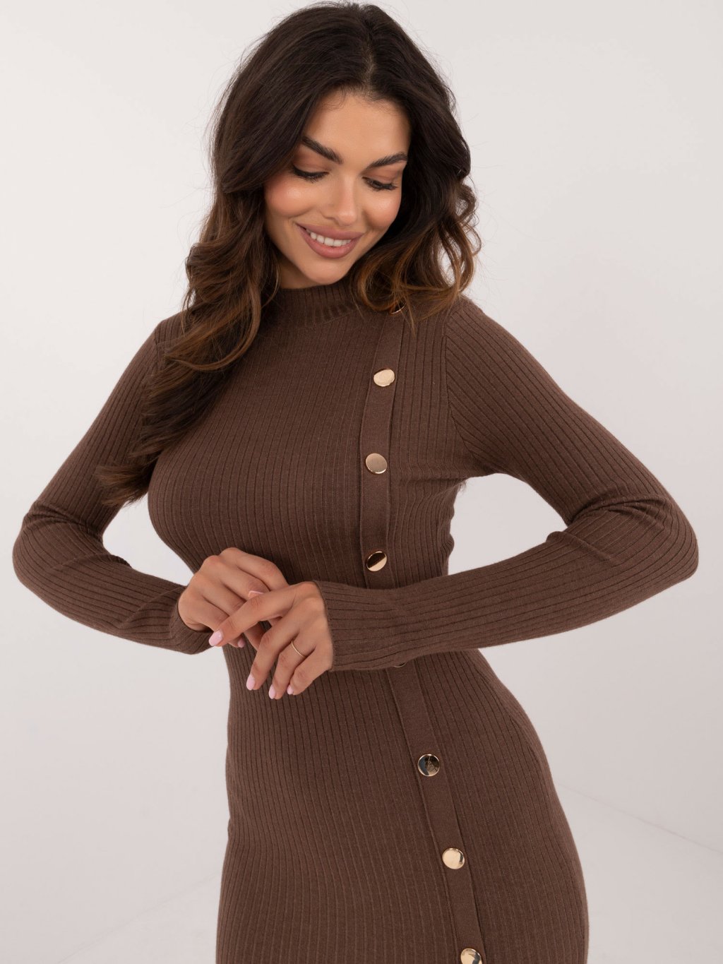 Tmavě hnědé pletené šaty se stojáčkem a ozdobnými cvočky