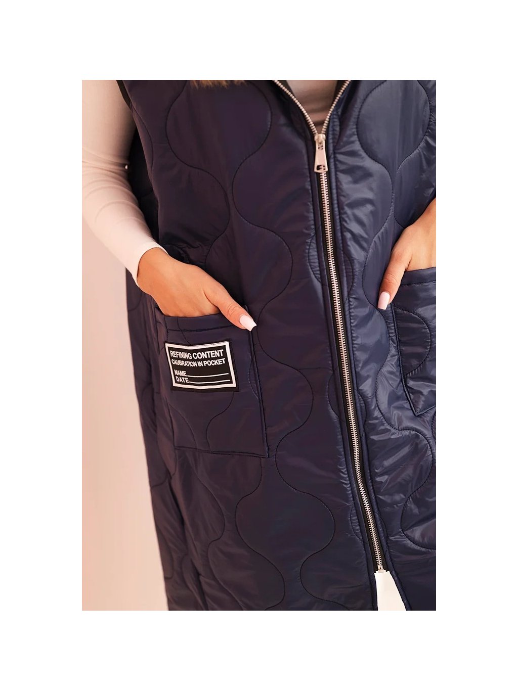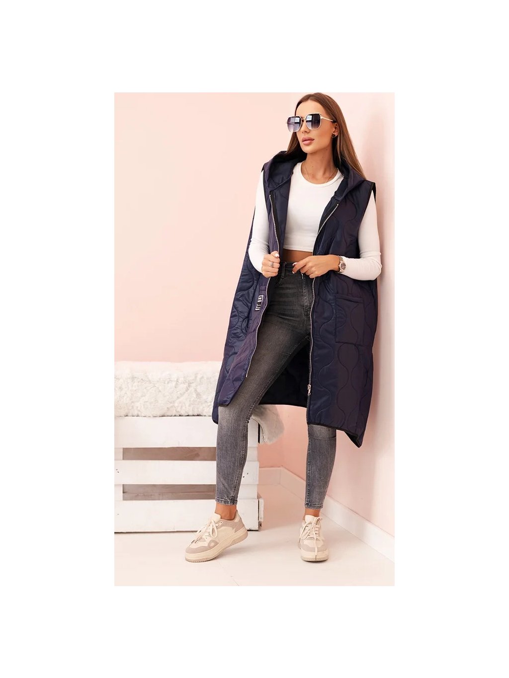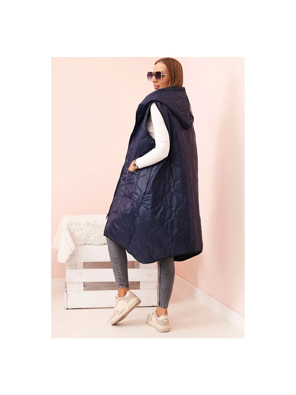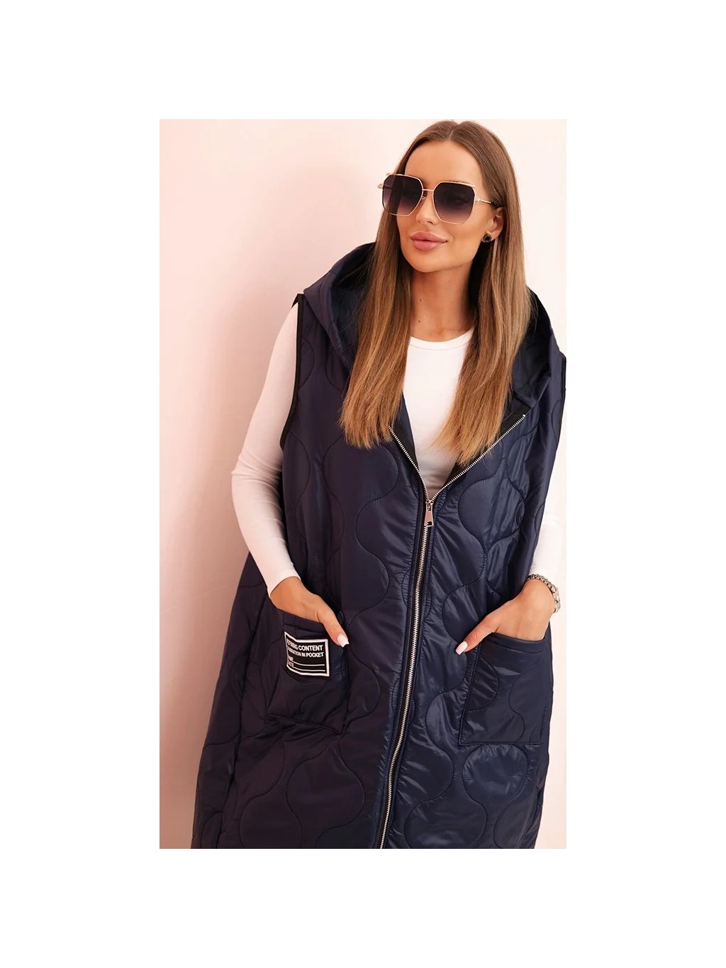 Tmavě modrá dámská oversize prošívaná vesta s kapucí na zip