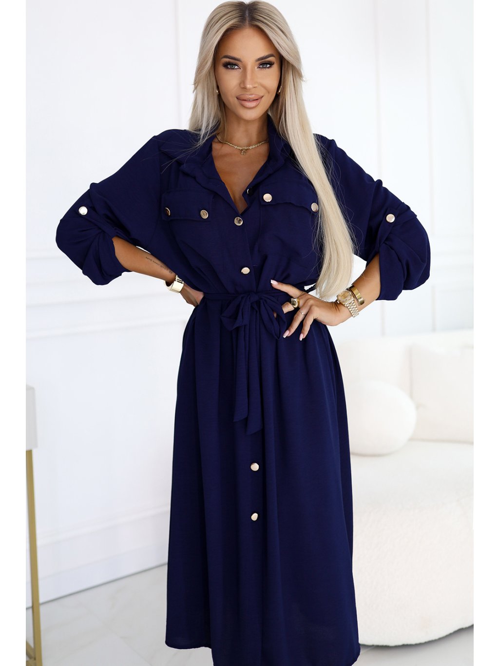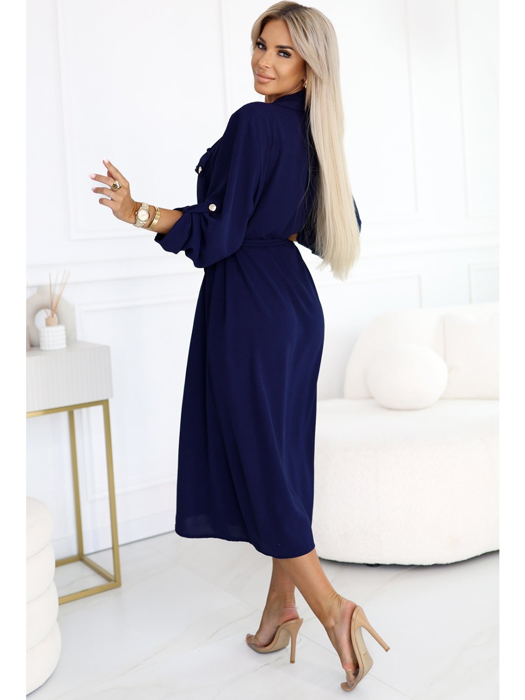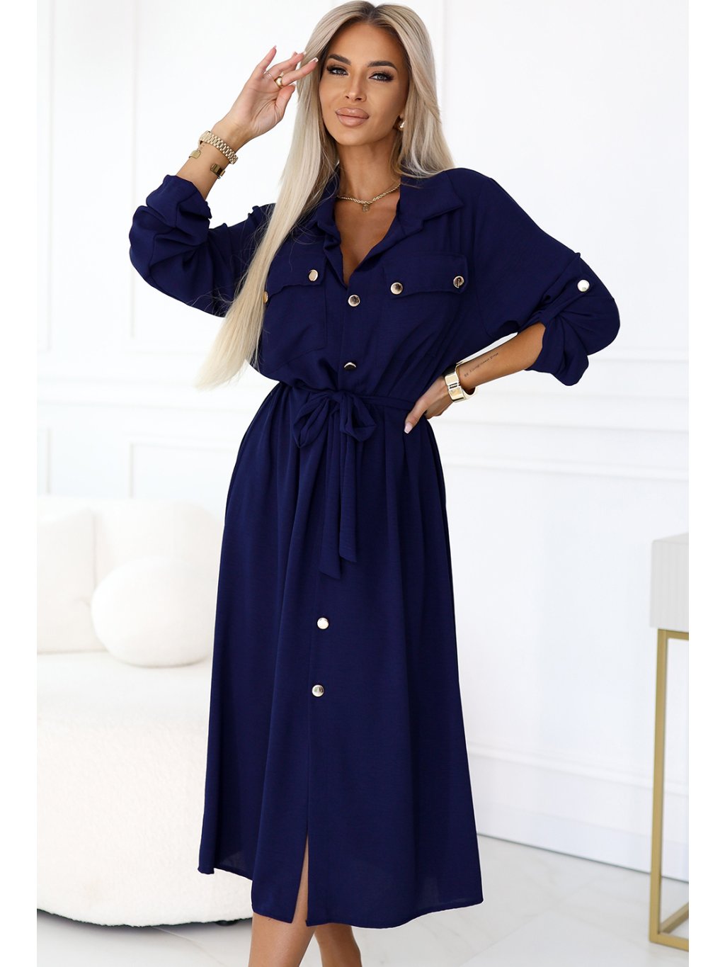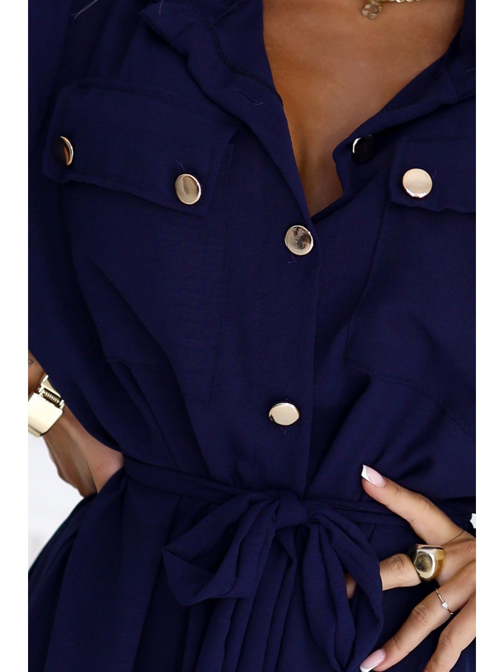 Tmavě modré košilové midi šaty s vázáním v pase