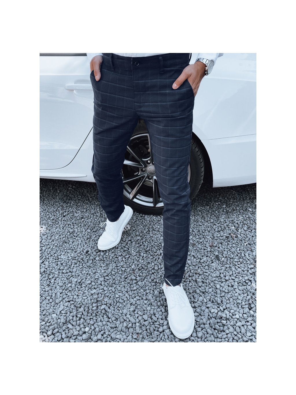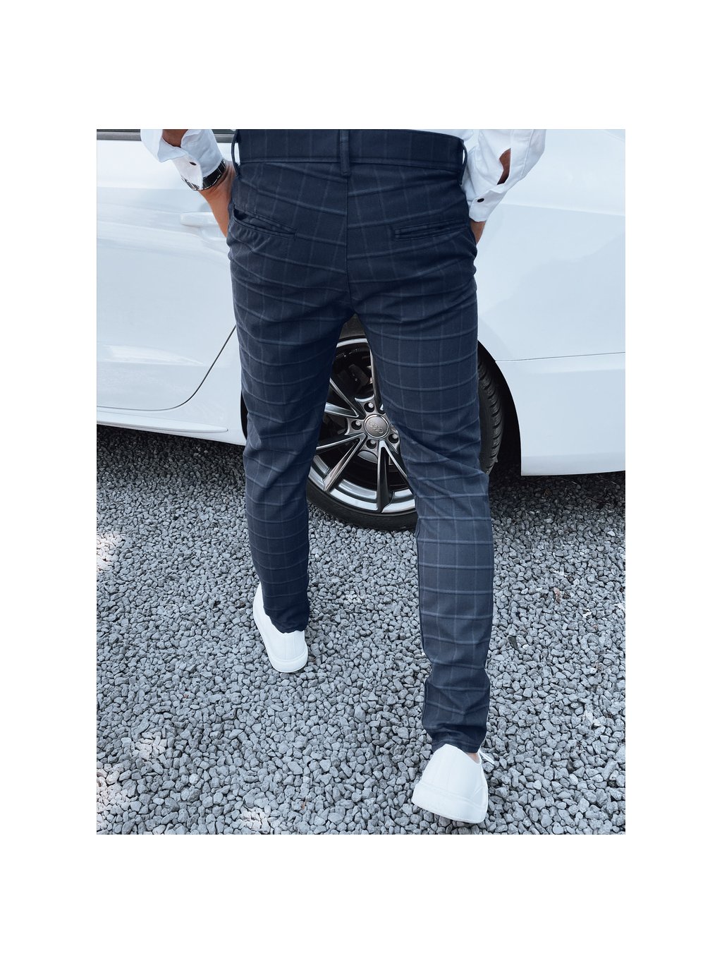 Tmavě modré kostkované společenské kalhoty