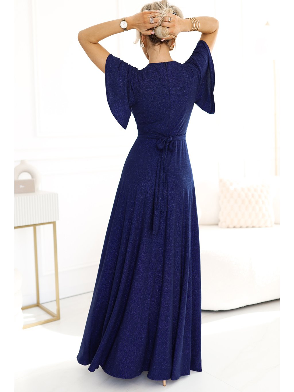 Tmavě modré lesklé dlouhé šaty s výstřihem JENNIFER
