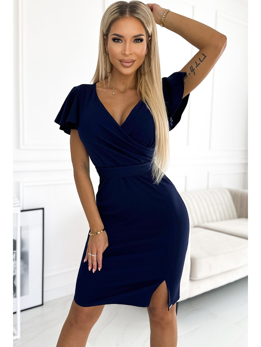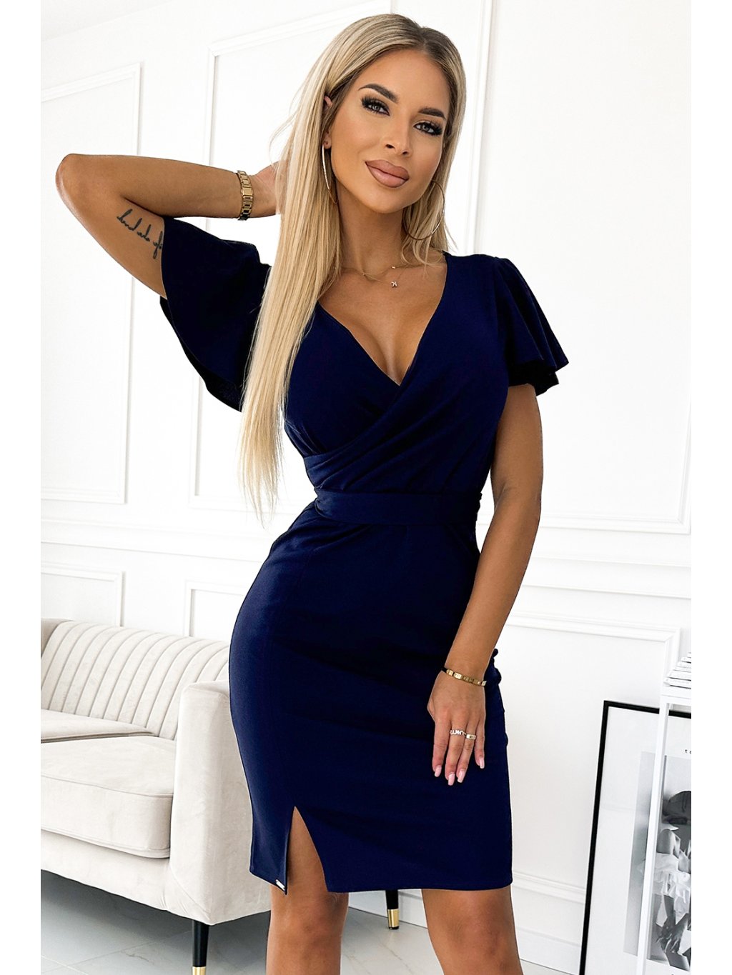 Tmavě modré šaty s výstřihem a páskem STEPHANIE