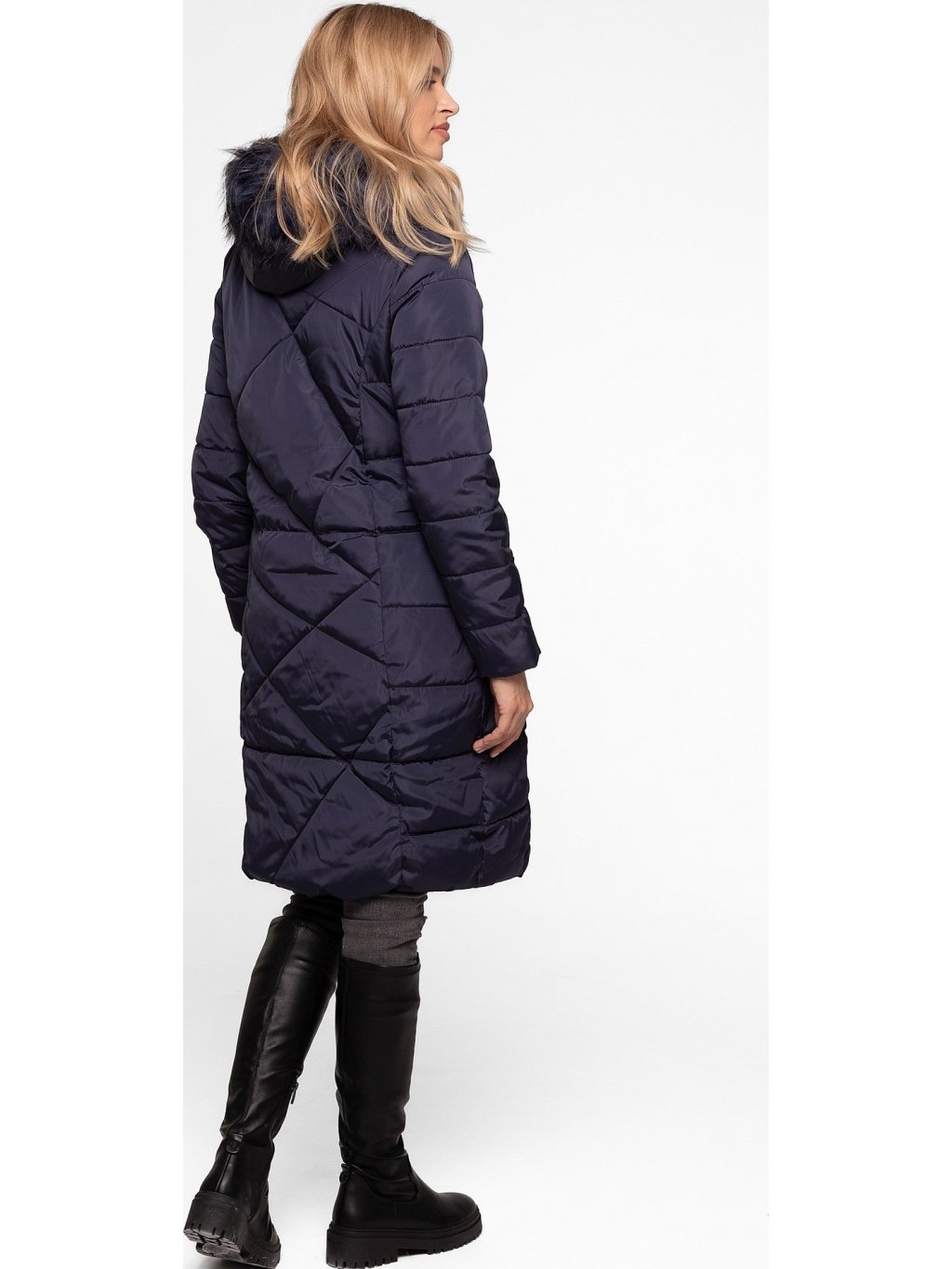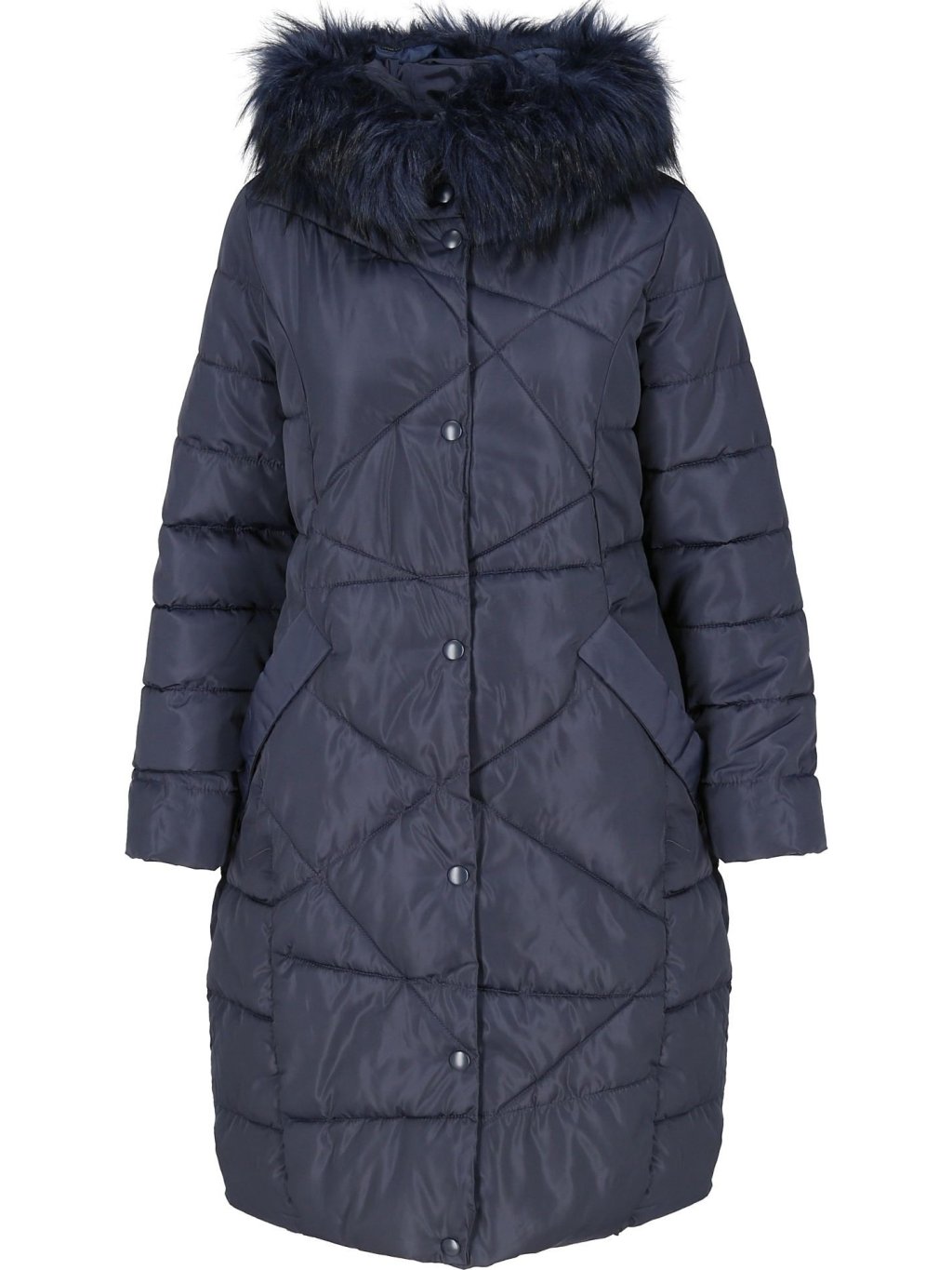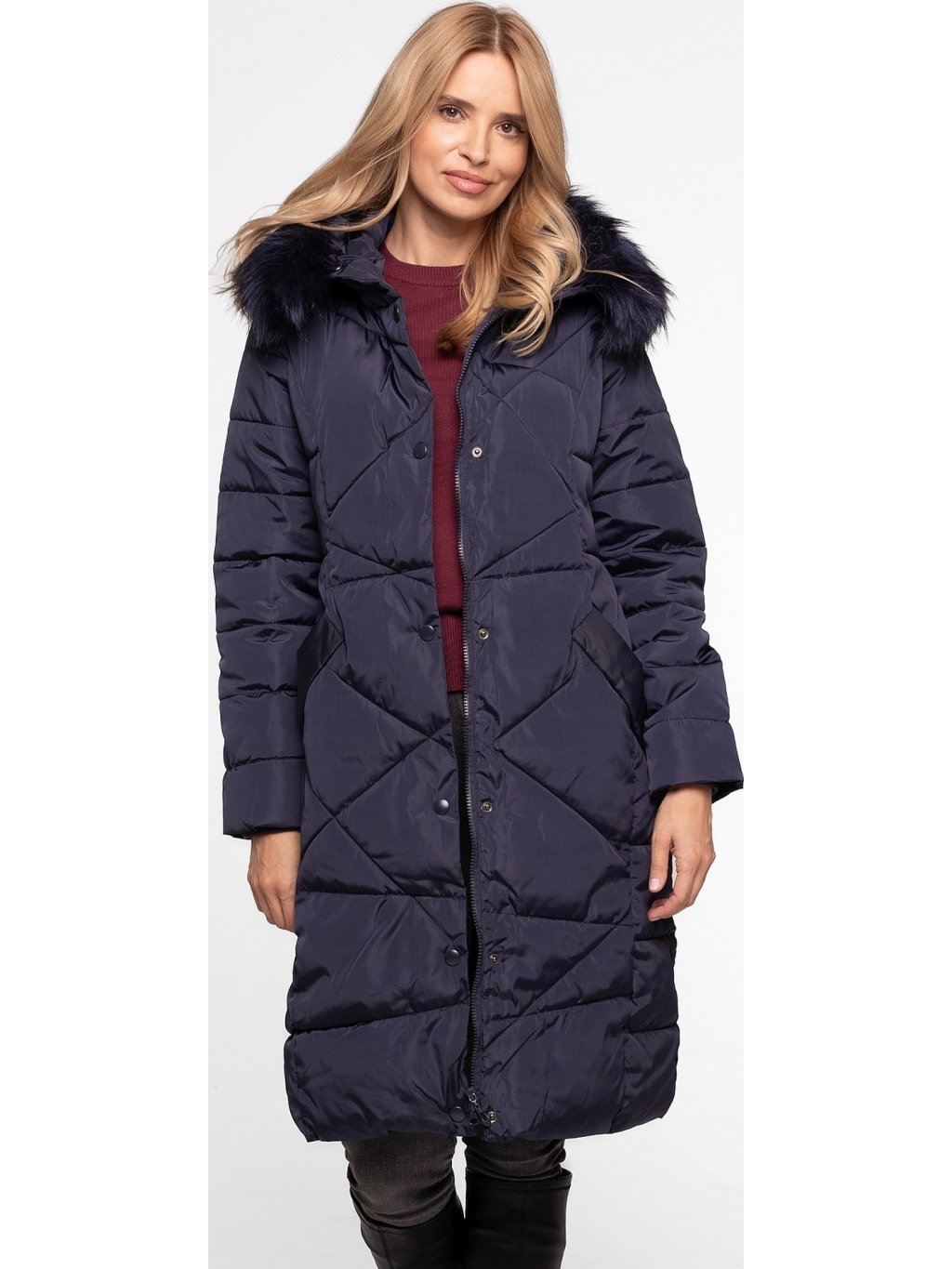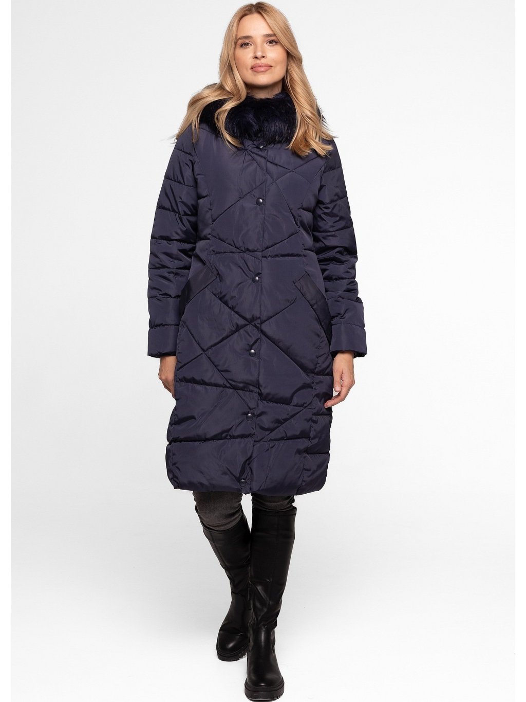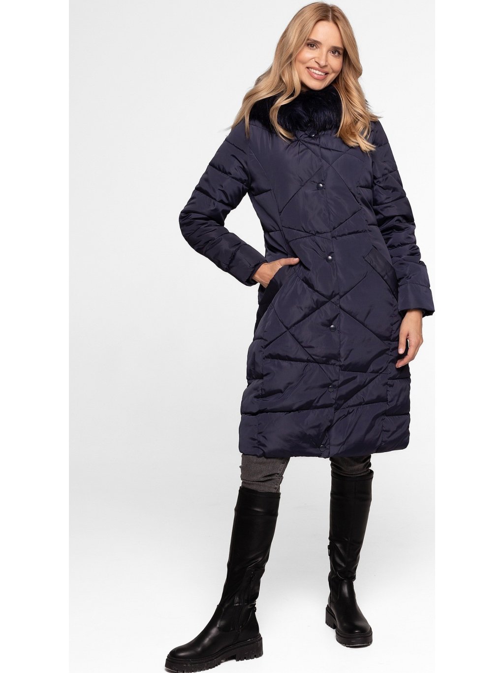 Tmavě modrý dámský dlouhý zimní prošívaný kabát